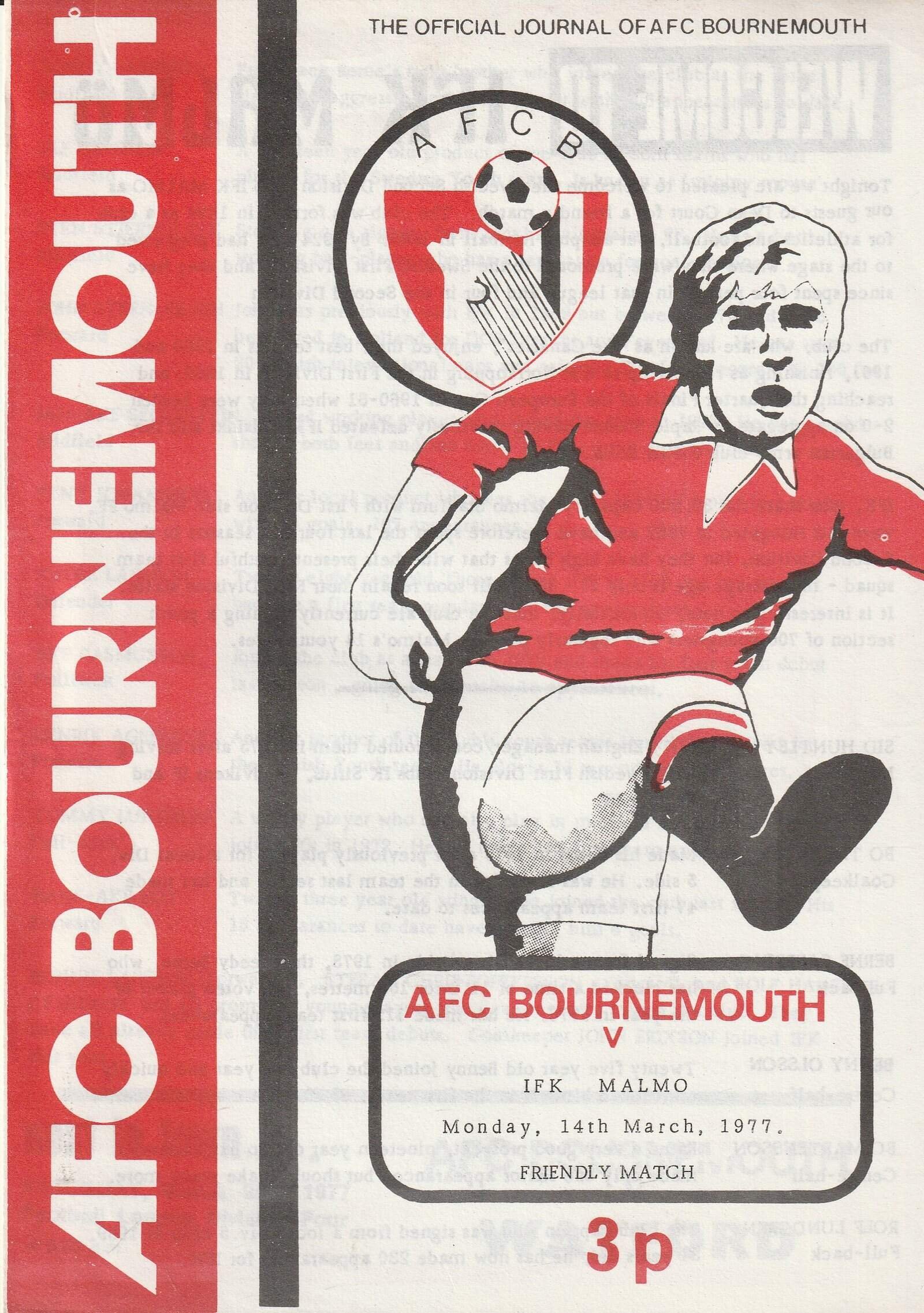 Match: AFC Bournemouth v IFK Malmo Competition: Friendly Date: 14-Mar-1977 Comments: 4 page issue Rating: 4 Condition: Very good Weight in grams: 40