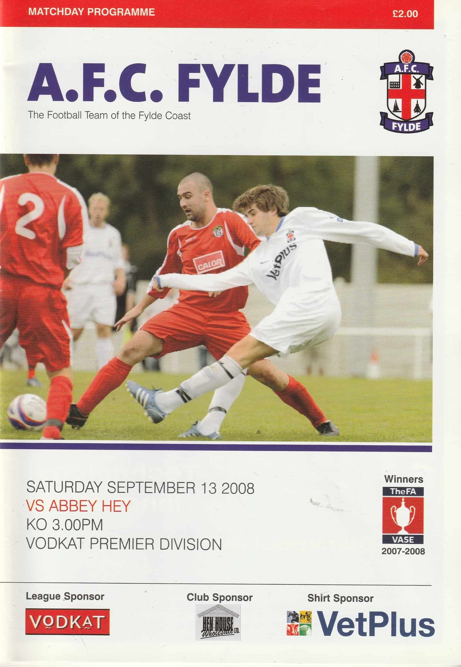 Match: AFC Fylde v Abbey Hey Competition: Vodkat Premier Division Date: 13-Sep-2008 Comments: Rating: 4 Condition: Very good Weight in grams:180