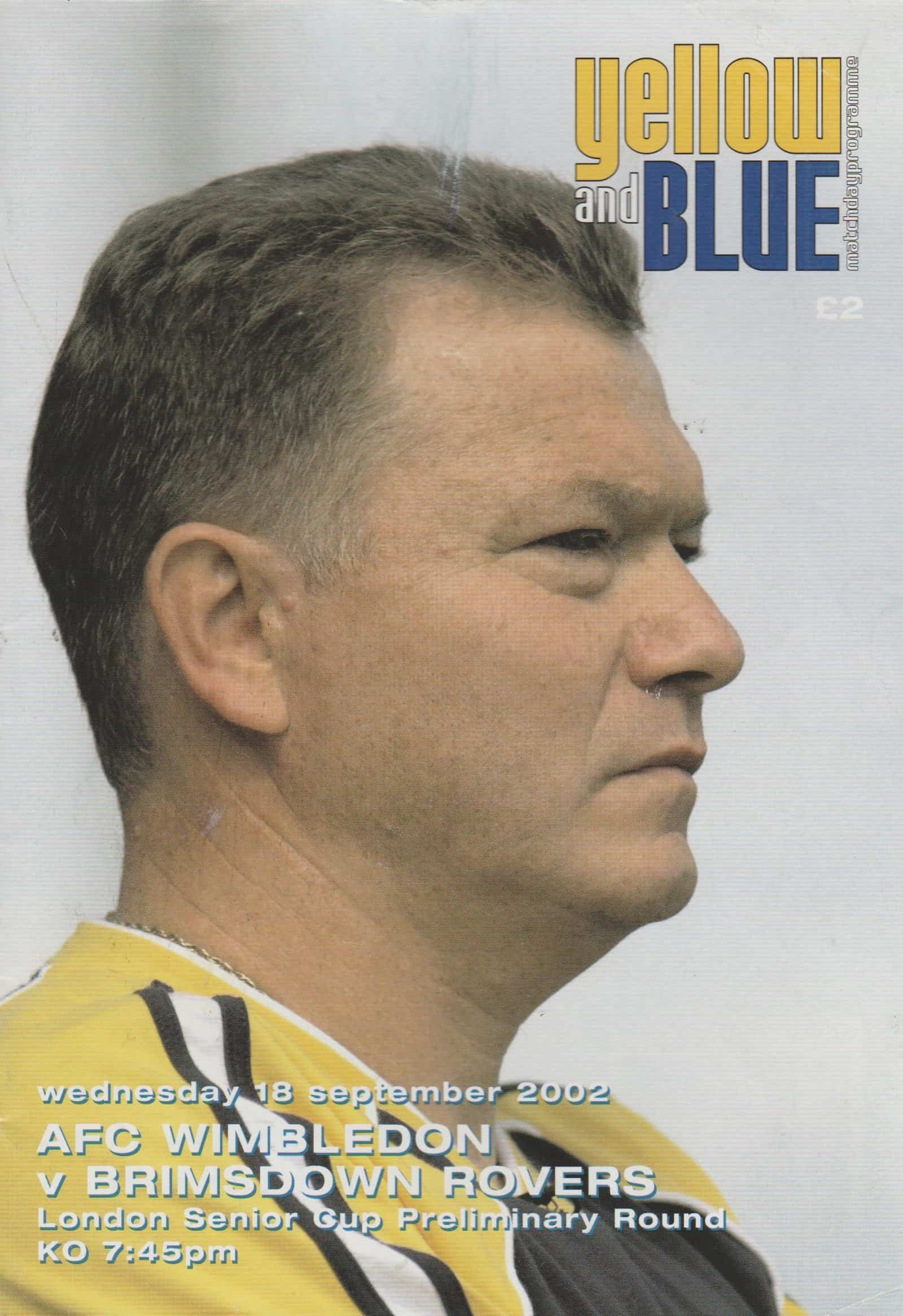 Match: AFC Wimbledon v Brimsdown Rovers Competition: London Senior Cup Preliminary Round Date: 18-Sep-2002 Comments: First season as newly formed club Rating: 3 Condition: Slight corner creases Weight in grams: 100