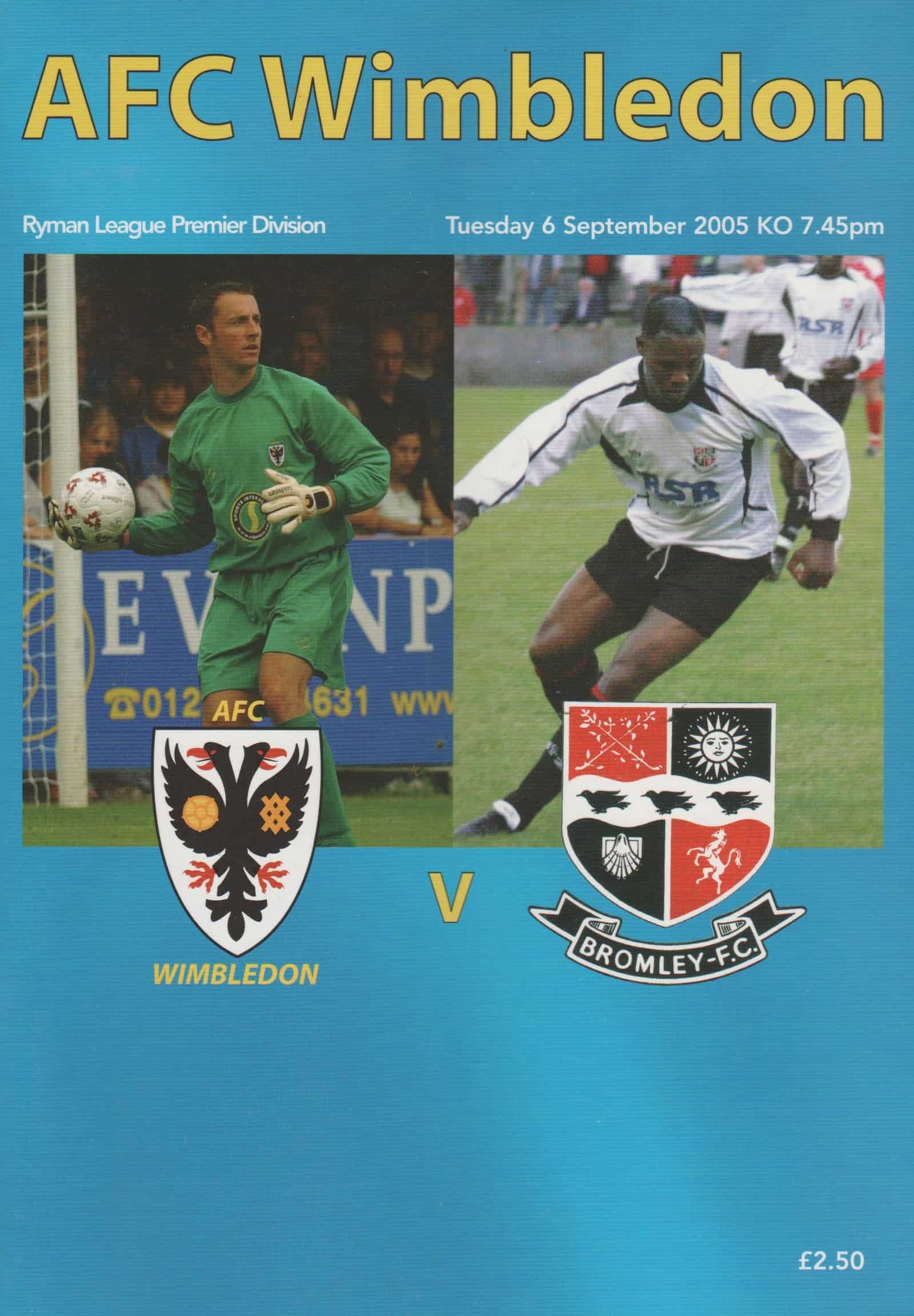 Match: AFC Wimbledon v Bromley Competition: Ryman League Premier Division Date: 06-Sep-2005 Comments: Rating: 4 Condition: Very good Weight in grams: 120