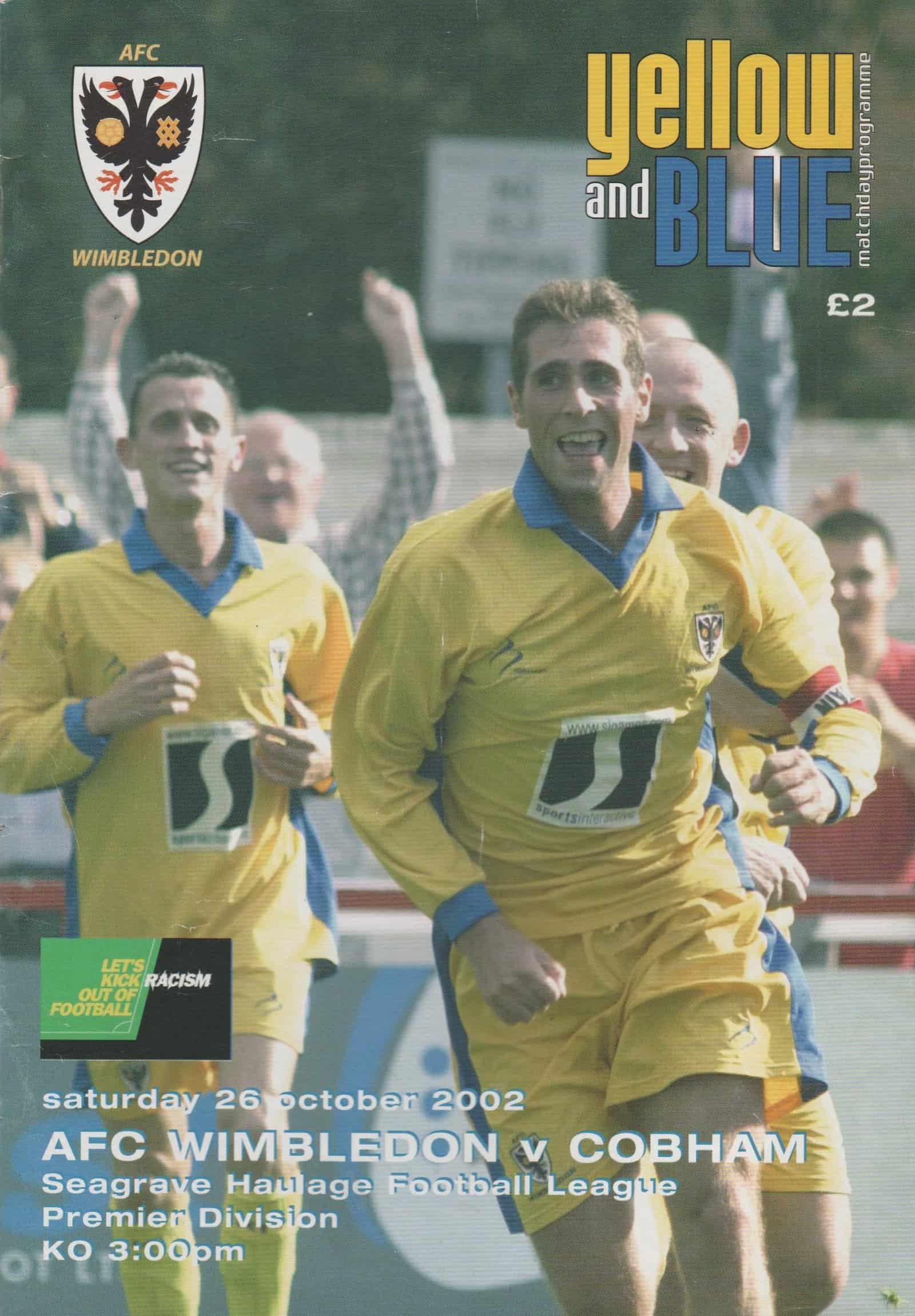 Match: AFC Wimbledon v Cobham Competition: Seagrave Haulage Premier Division Date: 26-Oct-2002 Comments: First season as newly formed club Rating: 4 Condition: Faint fold Weight in grams: 140