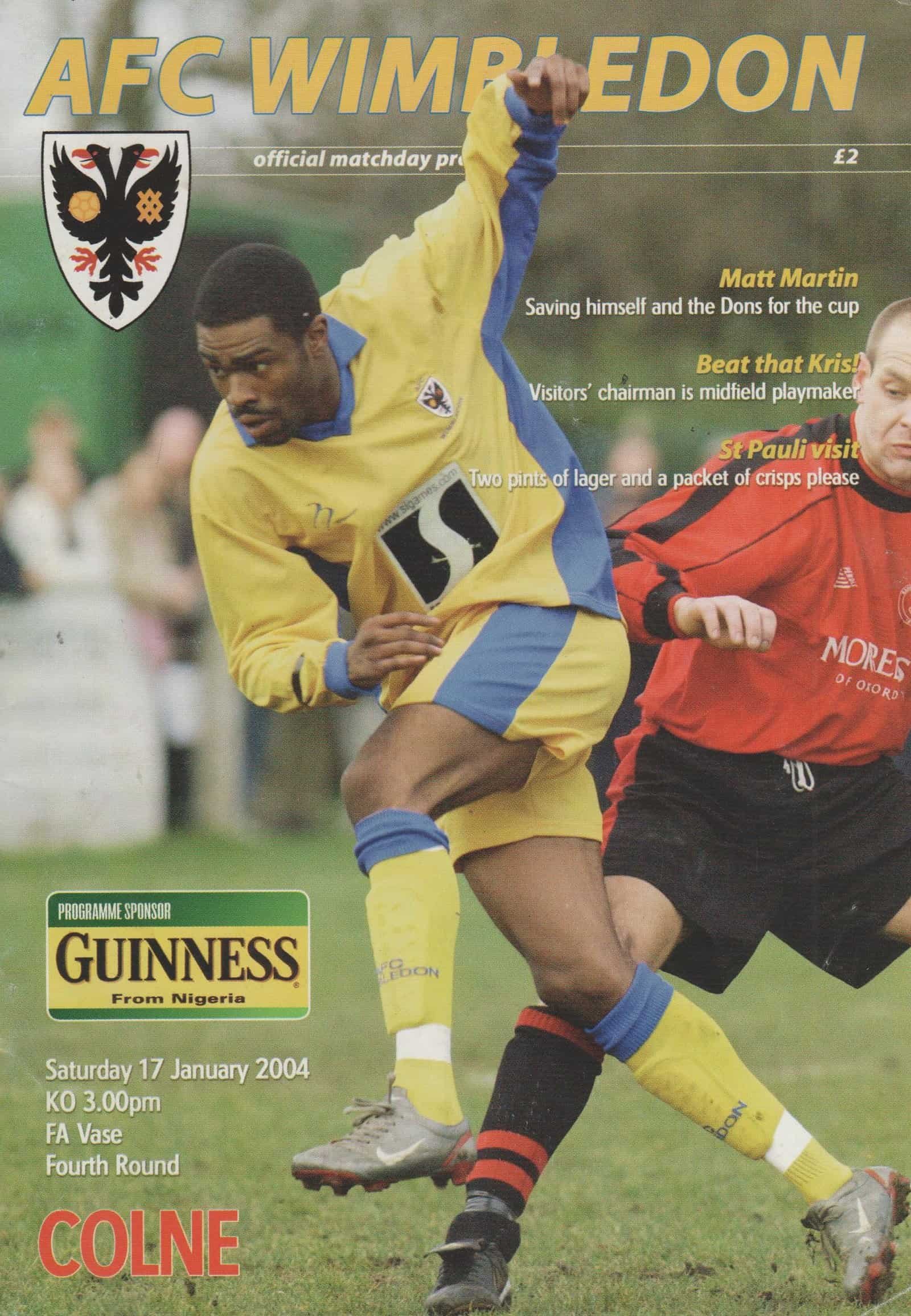 Match: AFC Wimbledon v Colne Competition: FA Vase 4th Round Date: 17-Jan-2004 Comments: Rating: 4 Condition: Very good Weight in grams: 120