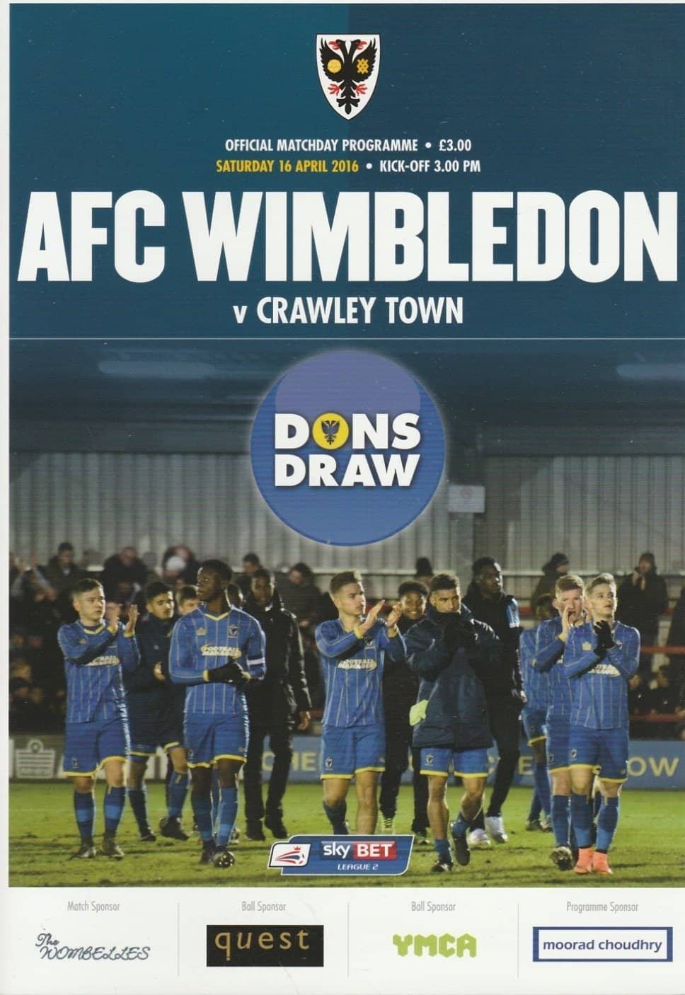 Match: AFC Wimbledon v Crawley Town Competition: League 1 Date: 16-Apr-2016 Comments: Rating: 4 Condition: Fold on back page Weight in grams: 200