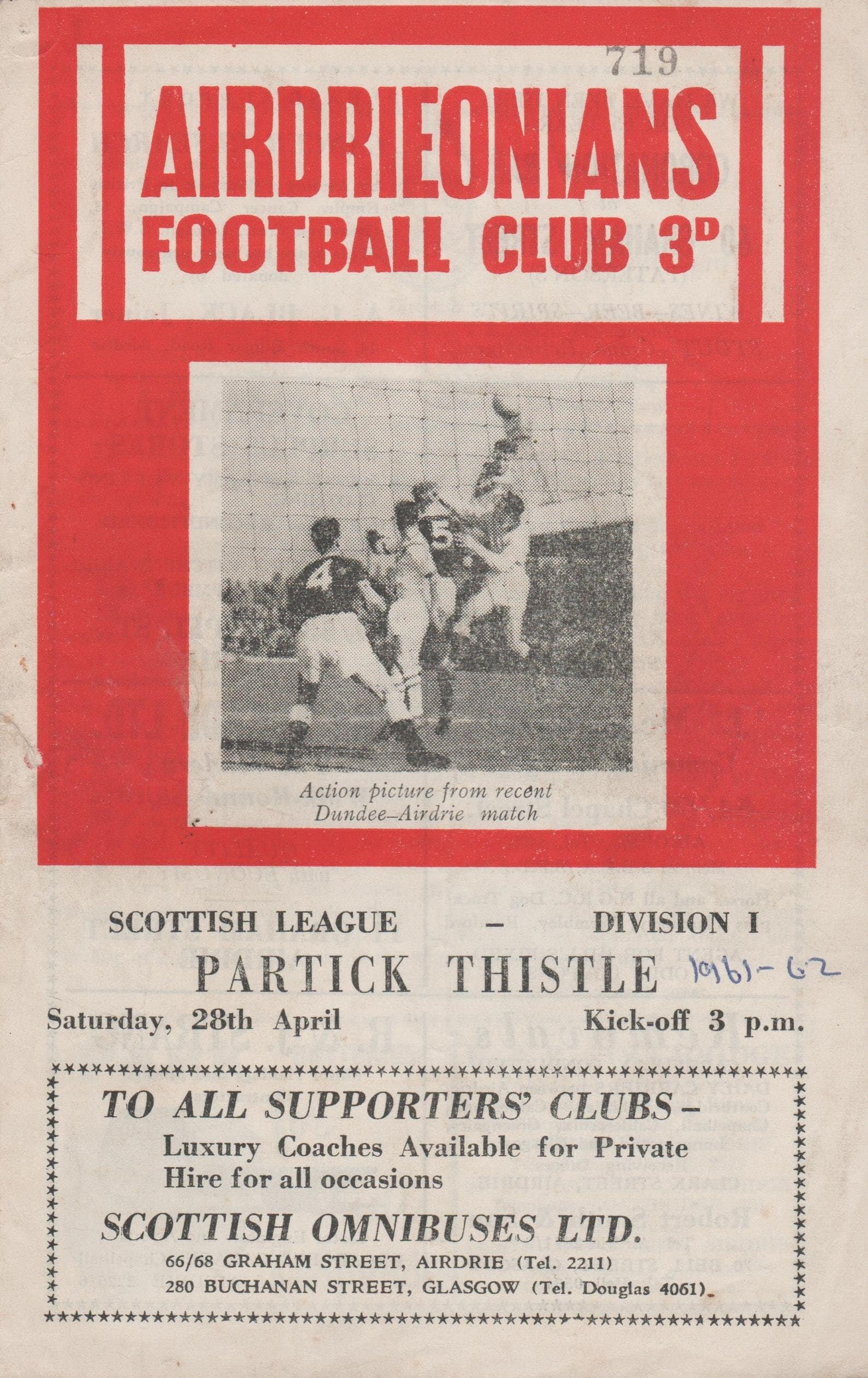 Match: Airdrieonians v Partick Thistle Competition: Scottish League Division 1 Date: 28-Apr-1962 Comments: Rating: 3 Condition: Fold, small tear on spine near staple, date written on cover Weight in grams: 40
