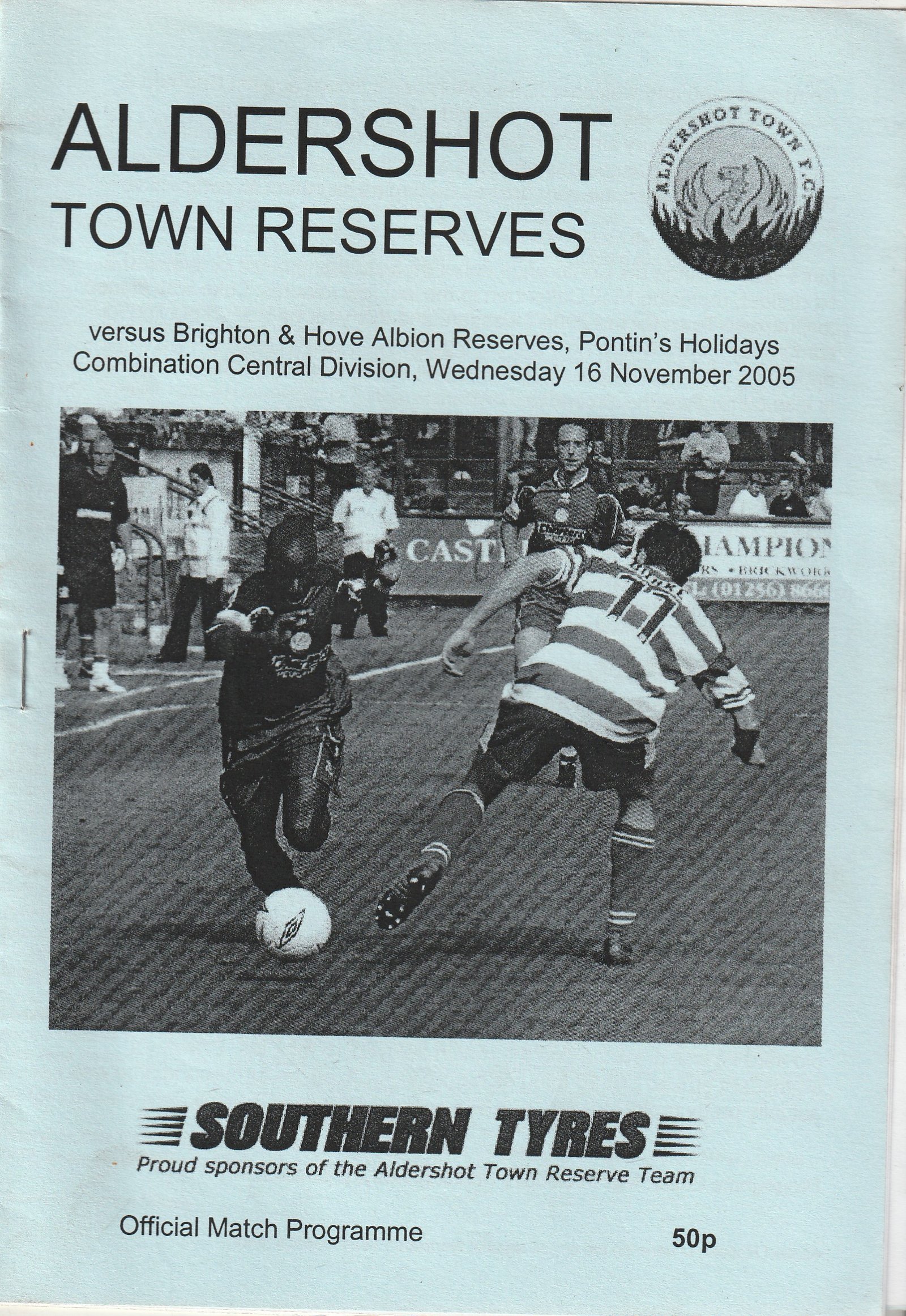 Match: Aldershot Town Reserves v Brighton & Hove Albion Reserves Competition: Pontins Holidays Combination Central Division Date: 16-Nov-2005 Comments: Rating: 4 Condition: Very good Weight in grams: 80