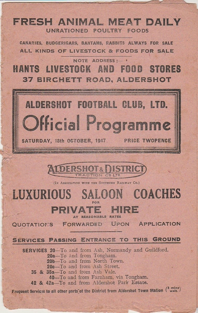 Match: Aldershot v Exeter City Competition: League Division 3 South Date: 18-Oct-1947 Comments: Rating: 3 Condition: Staples removed, holes on spine, frayed edges Weight in grams: 40