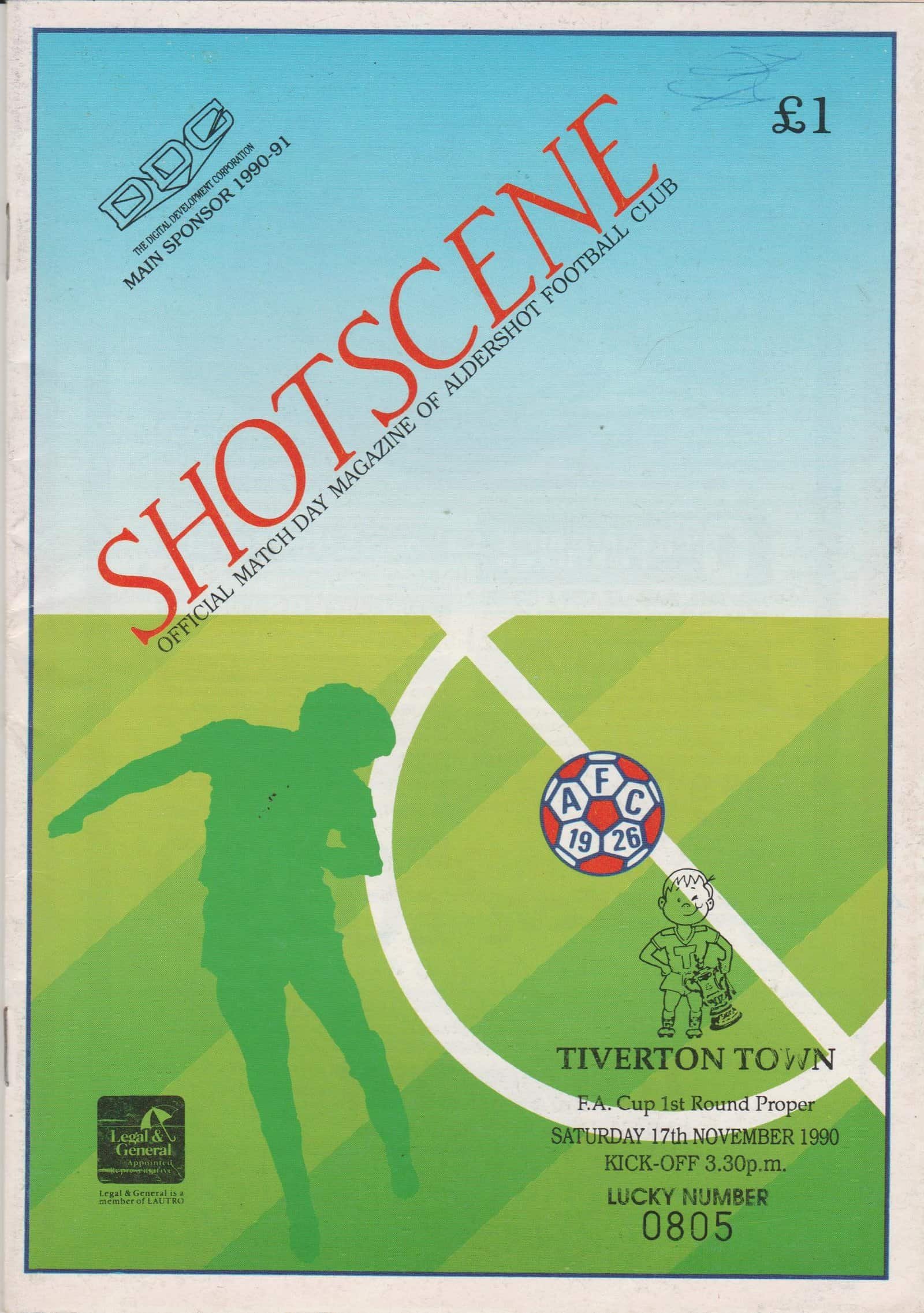 Match: Aldershot v Tiverton Town Competition: FA Cup 1st Round Date: 17-Nov-1990 Comments: Rating: 4 Condition: Very good Weight in grams: 80