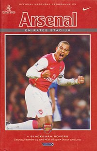 Match: Arsenal v Blackburn Rovers Competition: Premier League Date: 23-12-2006 Comments: 1st season at Emirates Stadium Rating: 4 Condition: Slight scuff on edge of cover Weight in grams: 200