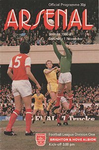 Match: Arsenal v Brighton and Hove Albion Competition: League Division 1 Date: 01-11-1980 Comments: Rating: 5 Condition: Excellent Weight in grams: 80