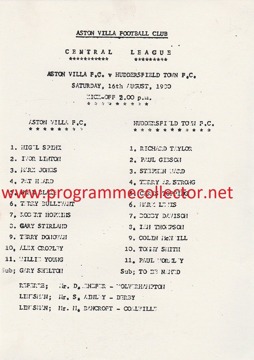 Match: Aston Villa Reserves v Huddersfield Town Reserves Competition: Central League Date: 16-Aug-1980 Comments: Single sheet issue Rating: 4 Condition: Very good Weight in grams: 20