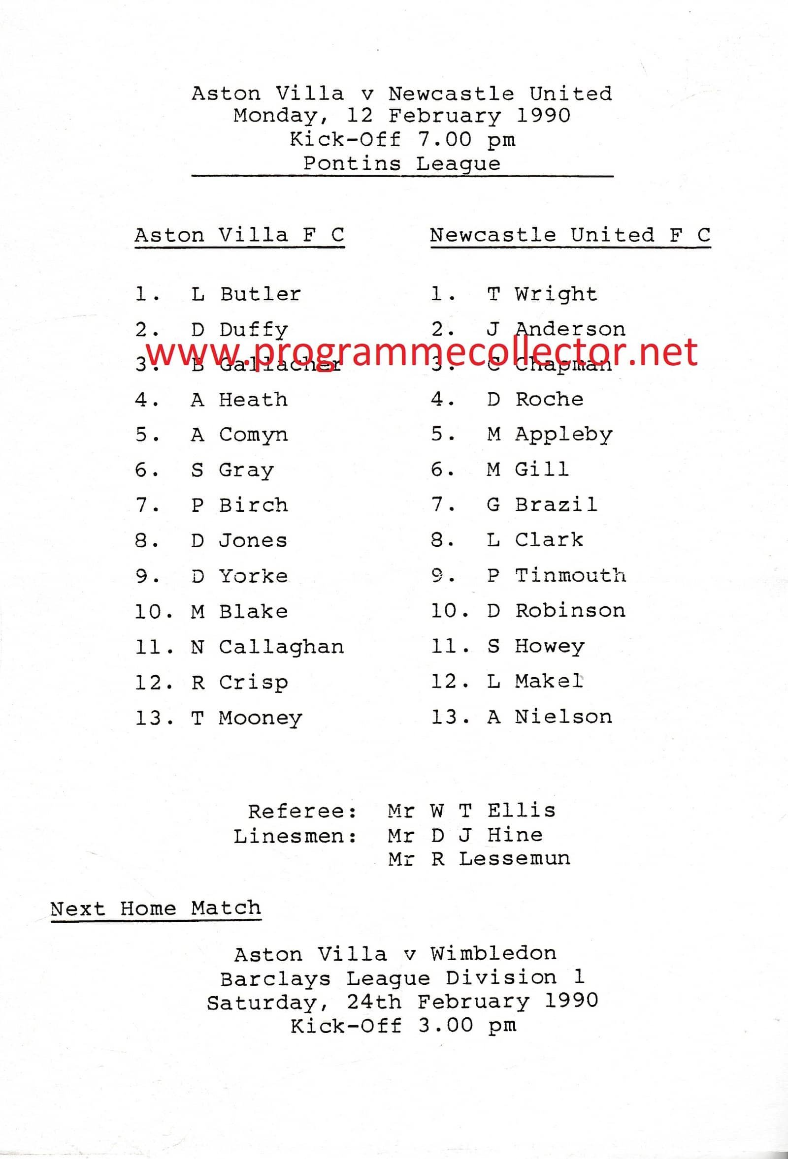 Match: Aston Villa Reserves v Newcastle United Reserves Competition: Pontins League Date: 12-Feb-1990 Comments: Single sheet issue Rating: 4 Condition: Faint fold Weight in grams: 20