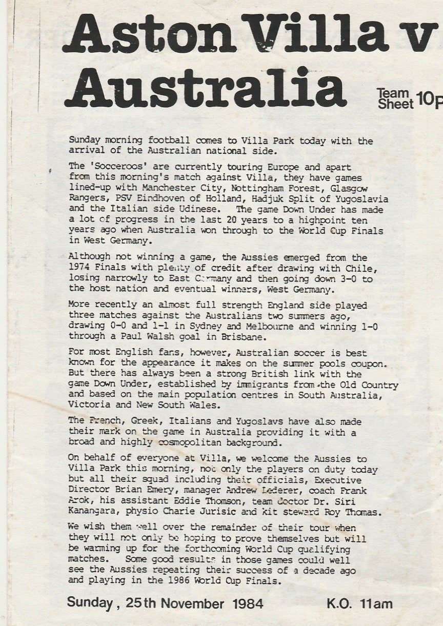 Match: Aston Villa v Australia Competition: Friendly Date: 25-Nov-1984 Comments: 4 page issue Rating: 3 Condition: Light creases Weight in grams: 40