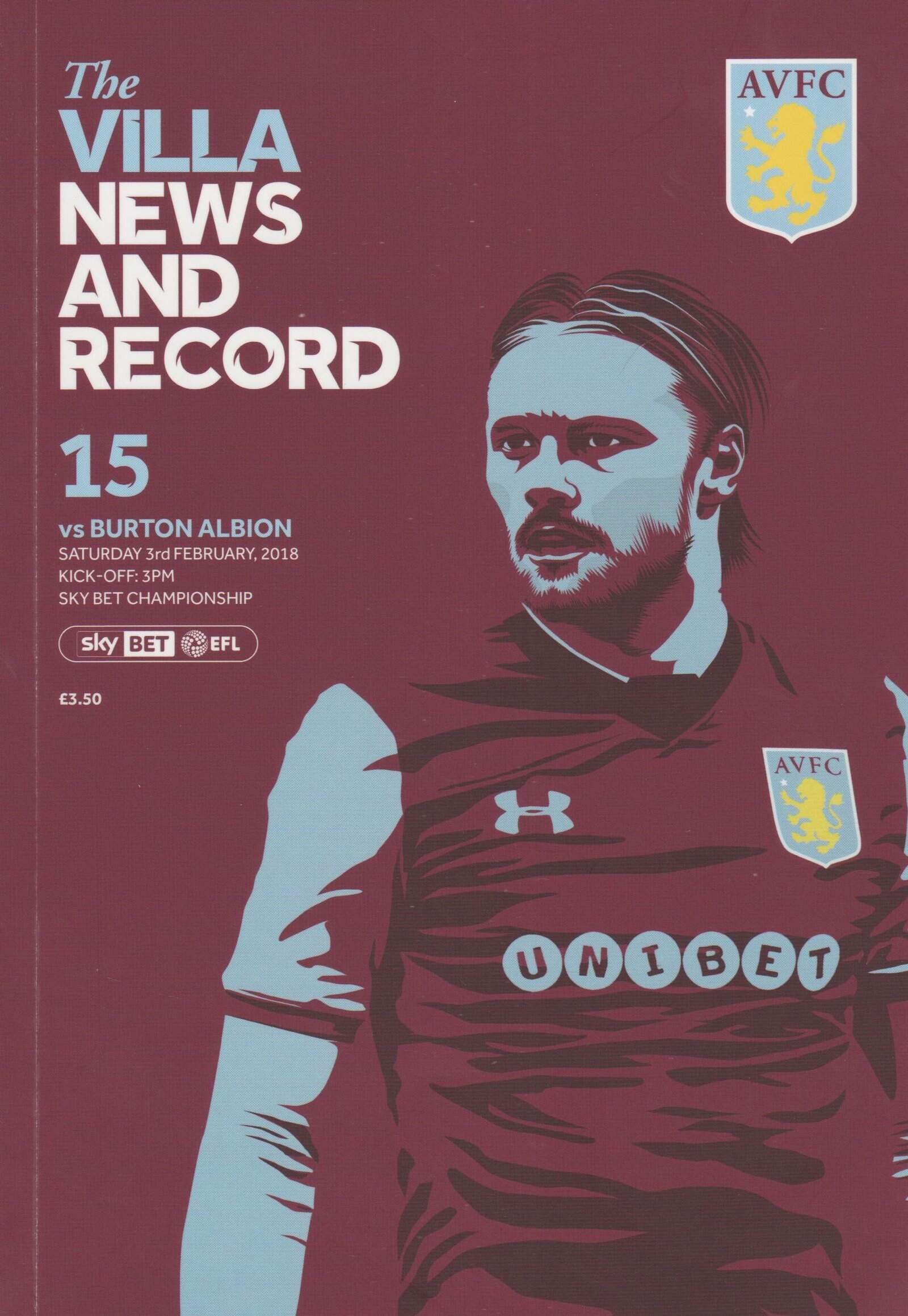 Match: Aston Villa v Burton Albion Competition: League Championship Date: 03-Feb-2018 Comments: Rating: 4 Condition: Very good Weight in grams: 200