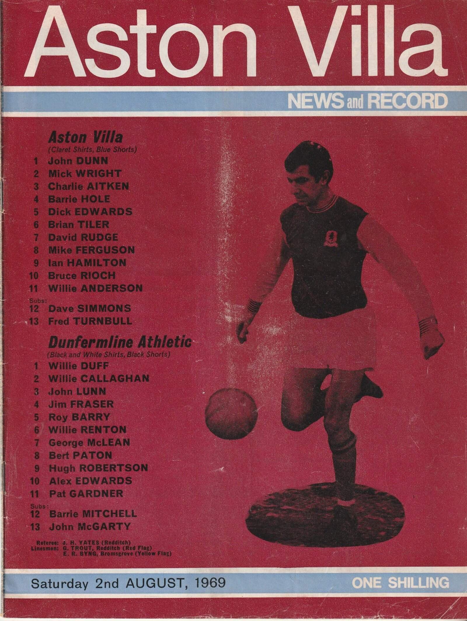 Match: Aston Villa v Dunfermline Athletic Competition: Friendly Date: 02-Aug-1969 Comments: Rating: 3 Condition: Handling wear and discolouring on cover Weight in grams: 120