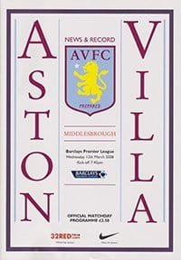 Match: Aston Villa v Middlesbrough Competition: Premier League Date: 12-03-2008 Comments: Rating: 5 Condition: Excellent Weight in grams: 200