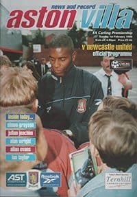 Match: Aston Villa v Newcastle United Competition: Premier League Date: 01-02-1998 Comments: Rating: 5 Condition: Excellent Weight in grams: 120