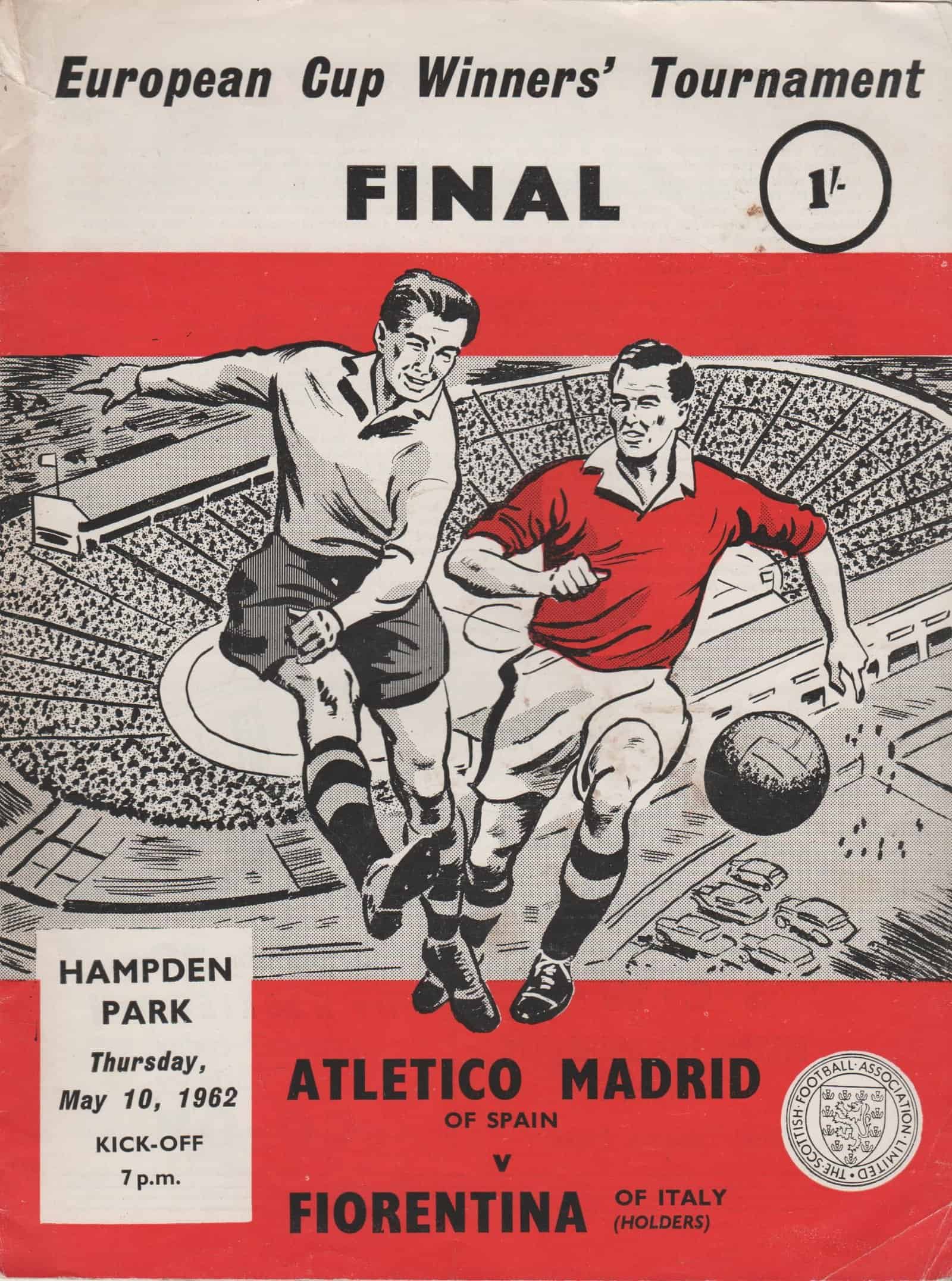 Match: Atletico Madrid v Fiorentina Competition: European Cup Winners Cup Final Date: 10-May-1962 Comments: Rating: 3 Condition: Tear on cover near spine, corner fold, marks on back Weight in grams: 80