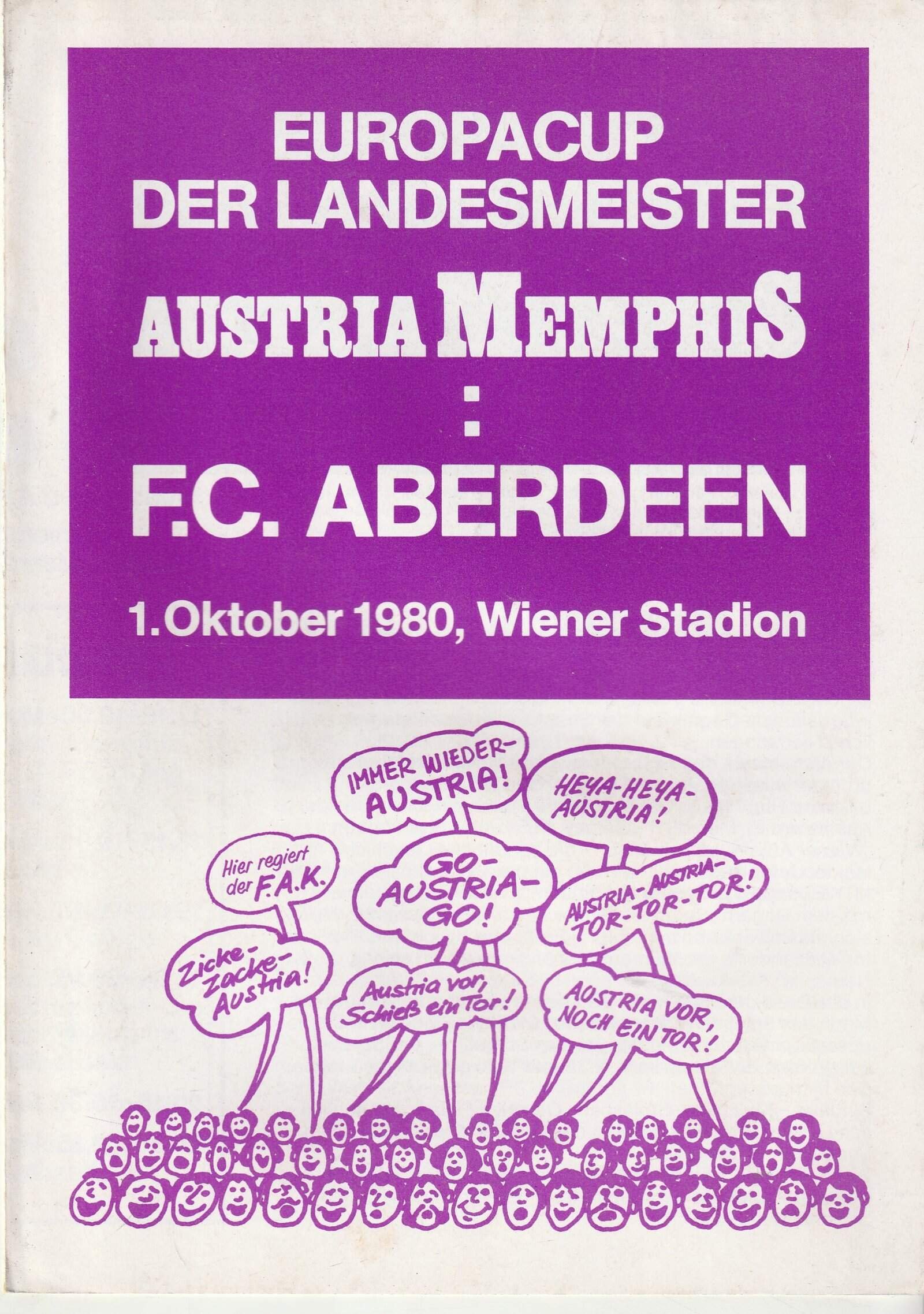 Match: Austria Memphis v Aberdeen Competition: European Cup 1st Round 2nd leg Date: 01-Oct-1980 Comments: 4 page issue Rating: 4 Condition: Very good Weight in grams: 40