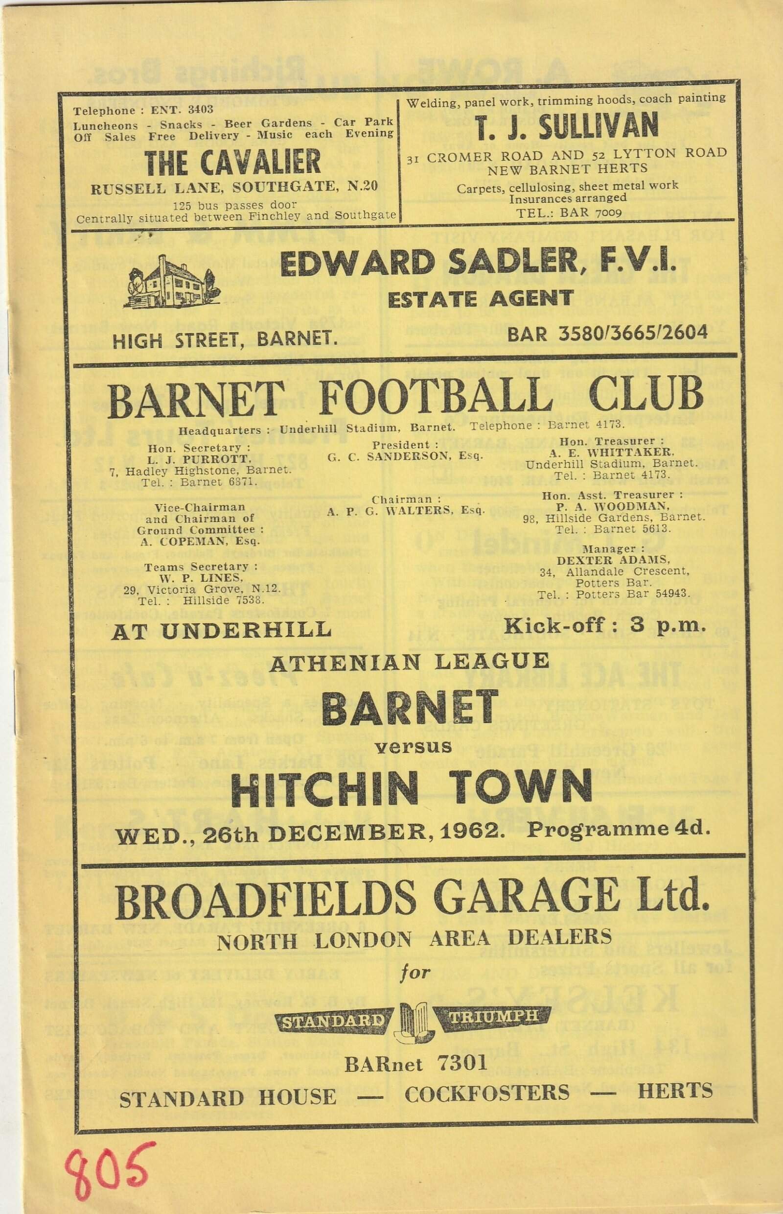 Match: Barnet v Hitchin Town Competition: Athenian League Date: 26-Dec-1962 Comments: Rating: 3 Condition: Number on cover Weight in grams: 40