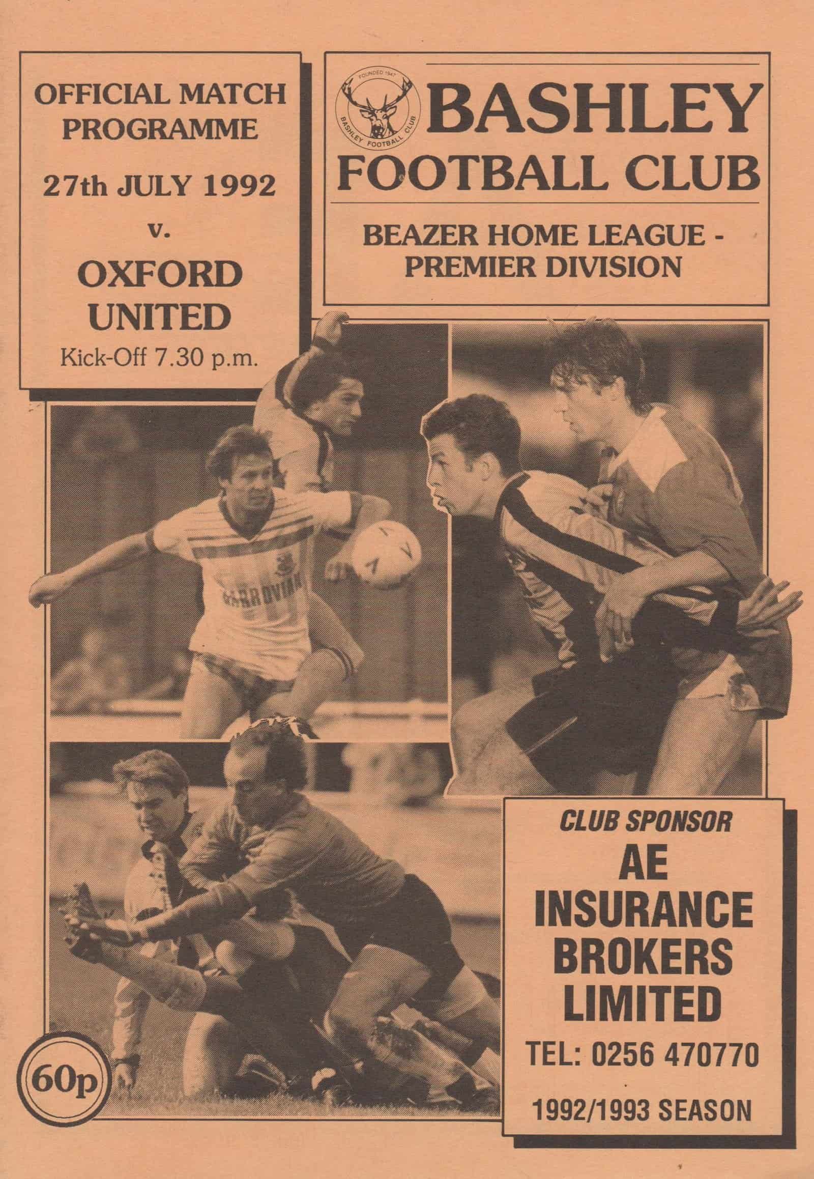 Match: Bashley v Oxford United Competition: Friendly Date: 27-Jul-1992 Comments: Rating: 4 Condition: Very good Weight in grams: 80