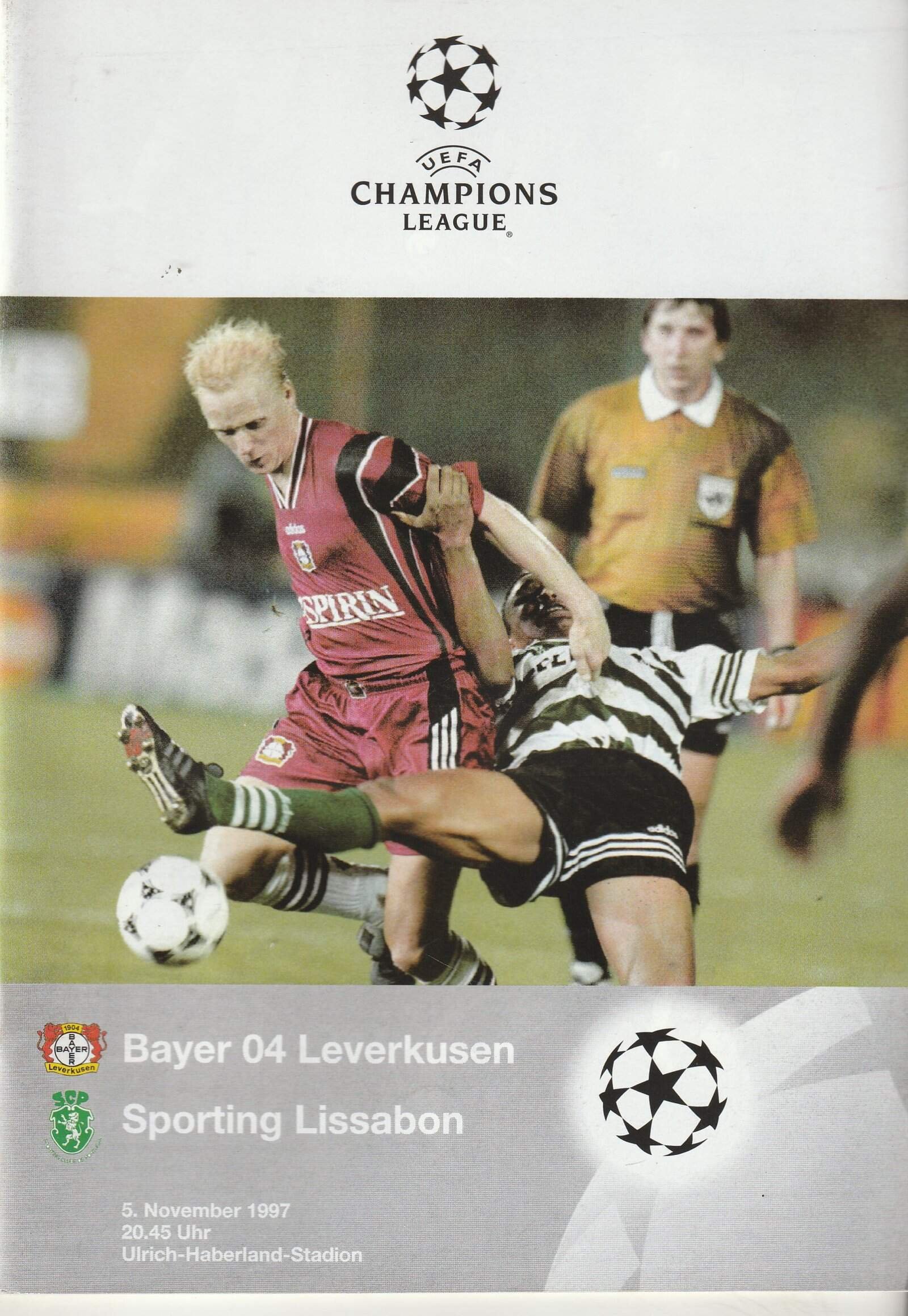 Match: Bayer 04 Leverkusen v Sporting Lisbon Competition: Champions League Group F Date: 05-Nov-1997 Comments: Rating: 4 Condition: Very good Weight in grams: 100