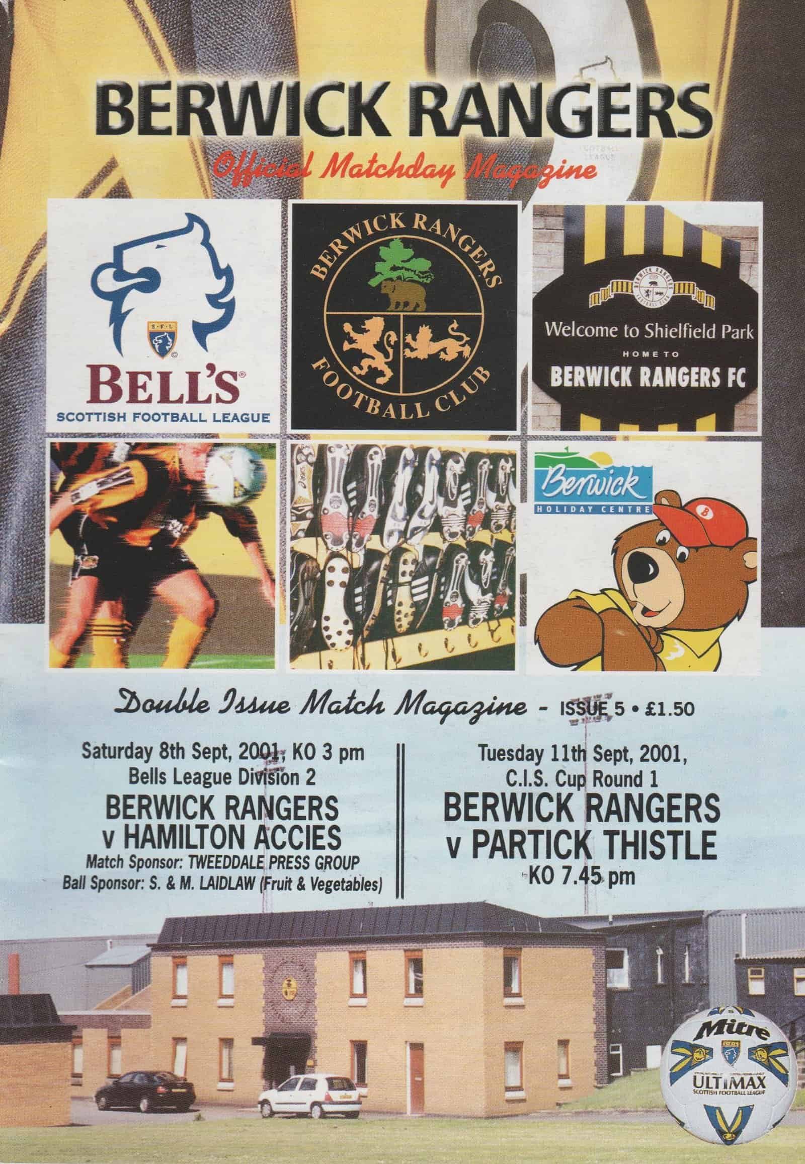 Match: Berwick Rangers v Partick Thistle Competition: Scottish League Cup 1st Round Date: 11-Sep-2001 Comments: Joint issue for Hamilton and Partick games Rating: 4 Condition: Very good Weight in grams: 60