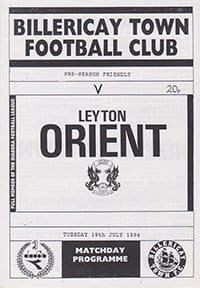 Match: Billericay Town v Leyton Orient Competition: Friendly Date: 19-07-1994 Comments: Rating: 5 Condition: Excellent Weight in grams: 40