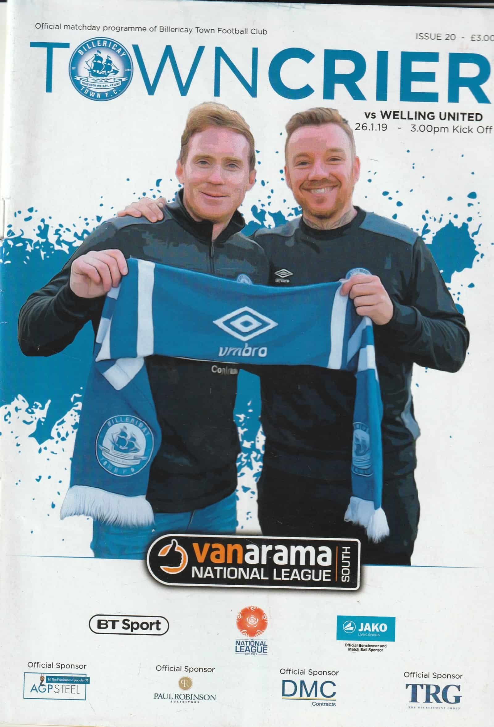 Match: Billericay Town v Welling United Competition: Vanarama National League South Date: 26-Jan-2019 Comments: Rating: 3 Condition: Tear on spine around staple Weight in grams: 140