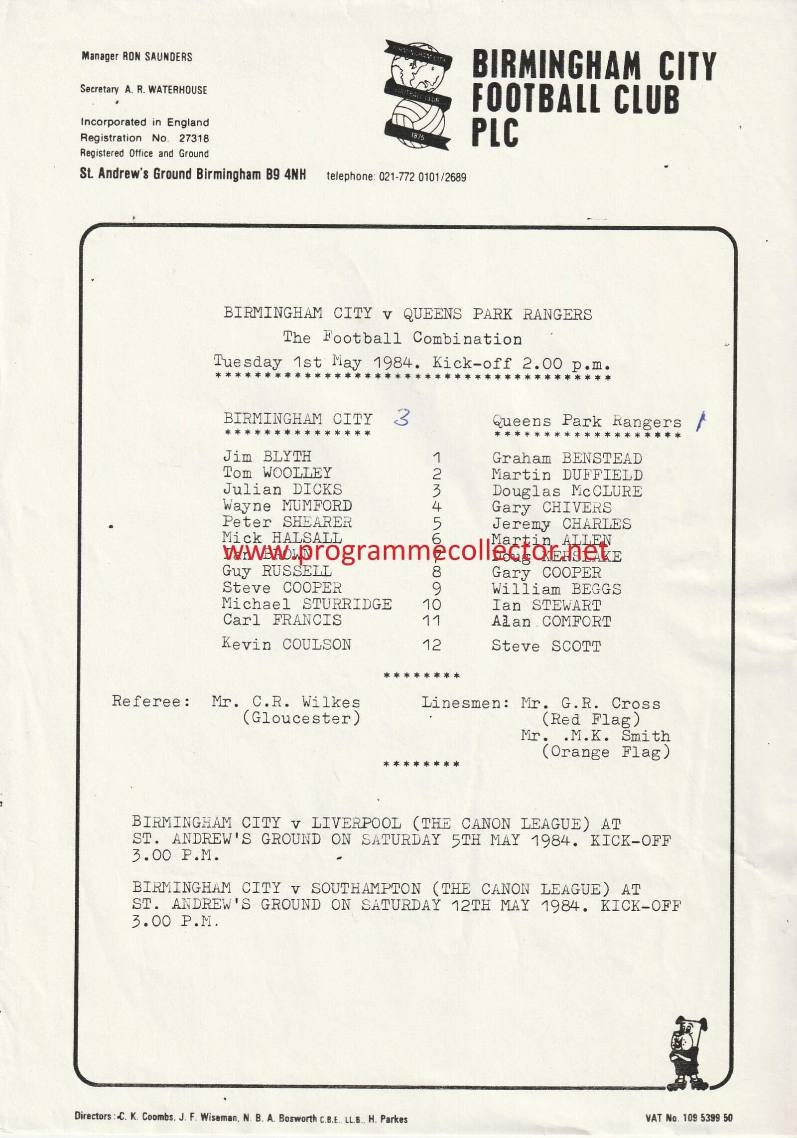 Match: Birmingham City Reserves v Queens Park Rangers Reserves Competition: Football Combination Date: 01-May-1984 Comments: Rating: 3 Condition: Score on face, light handling wear Weight in grams: 20