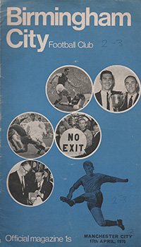 Match: Birmingham City v Manchester City Competition: Friendly Date: 17-04-1970 Comments: Ron Wylie Testimonial Rating: 3 Condition: Score on face, marks on back Weight in grams: 60