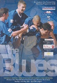 Match: Birmingham City v Preston North End Competition: League Division 1 Play-Offs Semi Final 1st leg Date: 13-05-2001 Comments: Rating: 4 Condition: Faint fold on corner of cover Weight in grams: 100