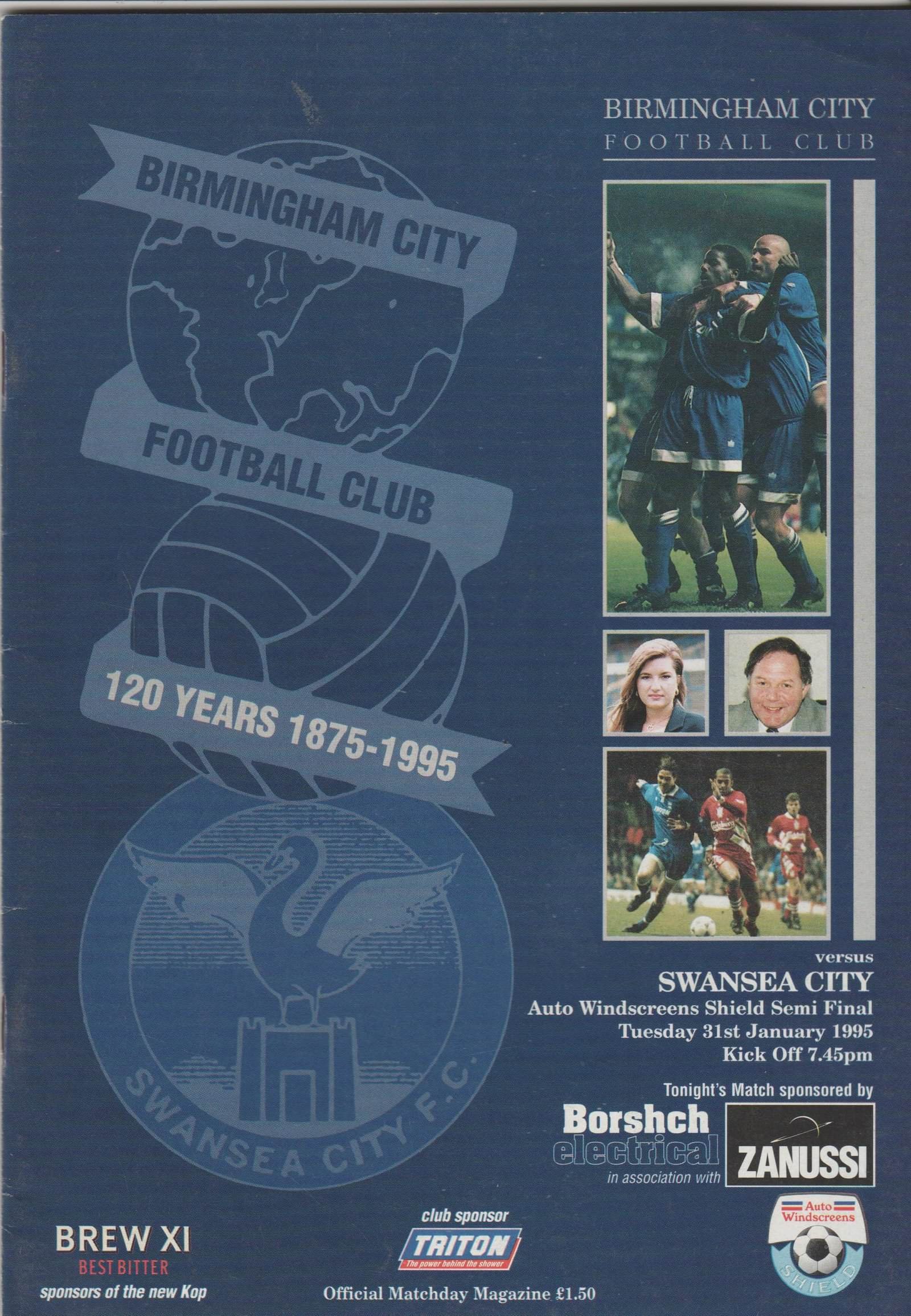 Match: Birmingham City v Swansea City Competition: Auto Windscreen Shield Semi Final Date: 31-Jan-1995 Comments: Rating: 4 Condition: Very good Weight in grams: 140