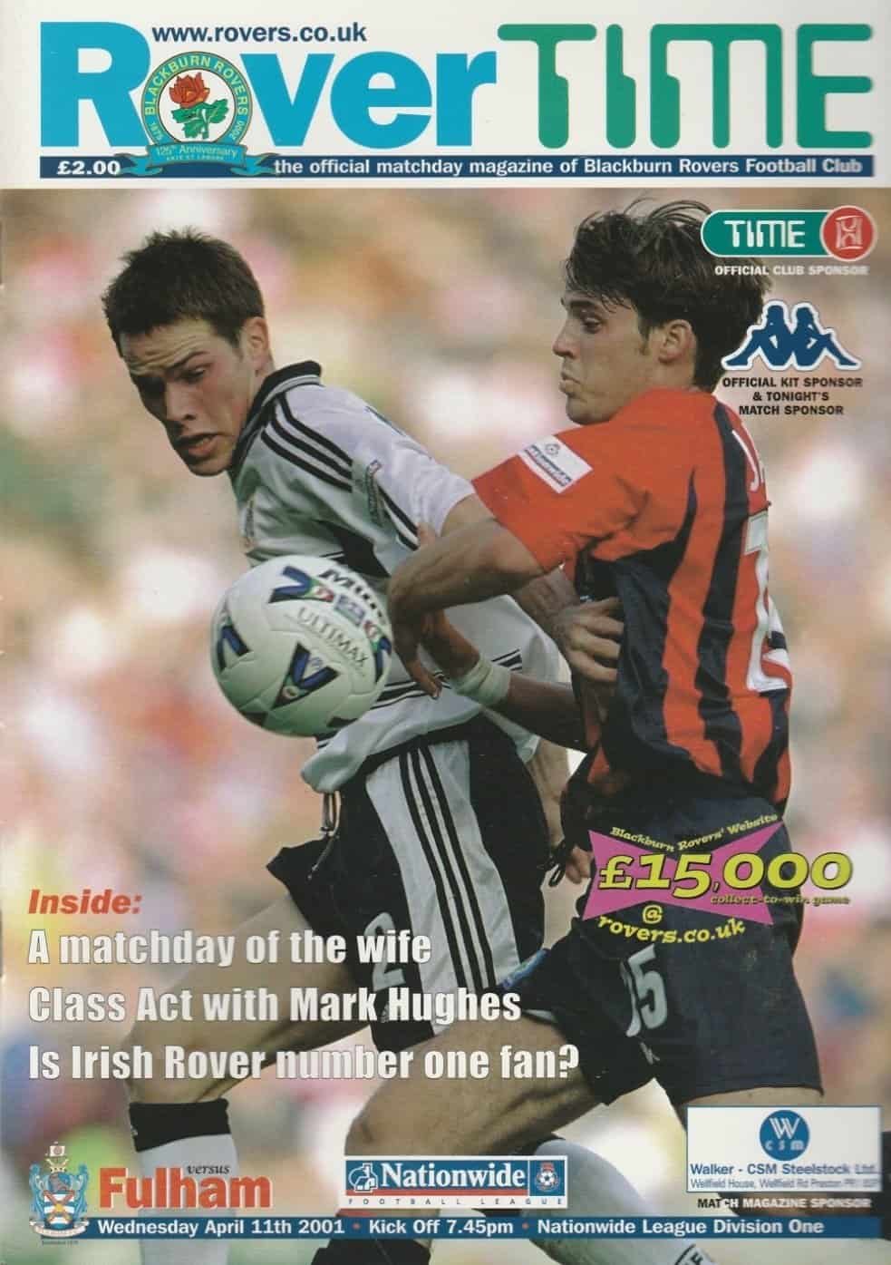 Match: Blackburn Rovers v Fulham Competition: League Division 1 Date: 11-Apr-2001 Comments: Rating: 4 Condition: Very good Weight in grams: 180