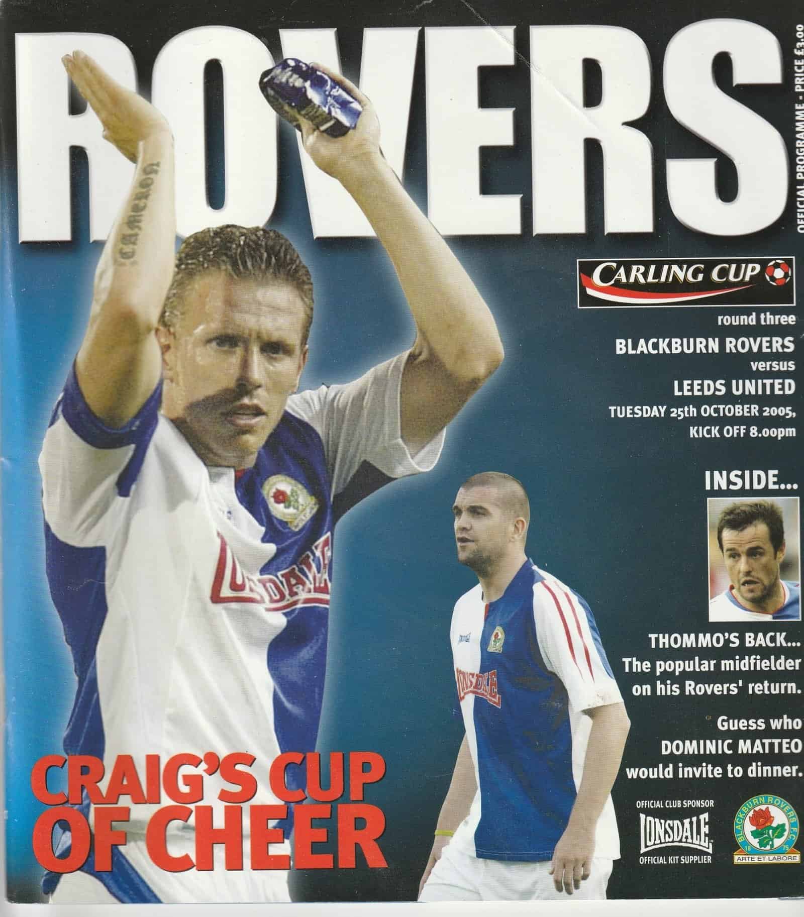 Match: Blackburn Rovers v Leeds United Competition: Carling Cup 3rd Round Date: 25-Oct-2005 Comments: Rating: 3 Condition: Tear on edge of cover, fold on corner of cover, wear to top edge of spine Weight in grams: 280