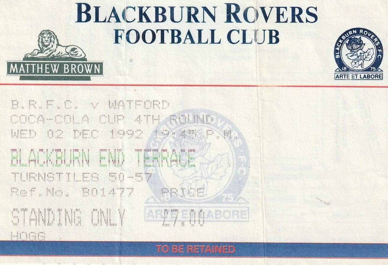 Match: Blackburn Rovers v Watford Competition: Coca Cola Cup 4th Round Date: 02-Dec-1992 Comments: Rating: 3 Condition: Light folds Weight in grams: 20