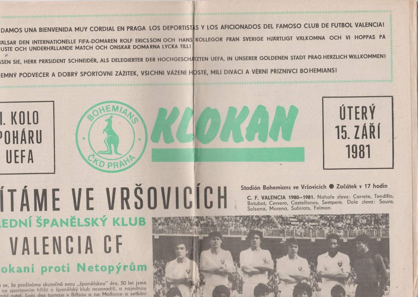 Match: Bohemians Prague v Valencia Competition: UEFA Cup 1st Round 1st leg Date: 15-Sep-1981 Comments: Tabloid newspaper folded Rating: 4 Condition: Very good Weight in grams: 60