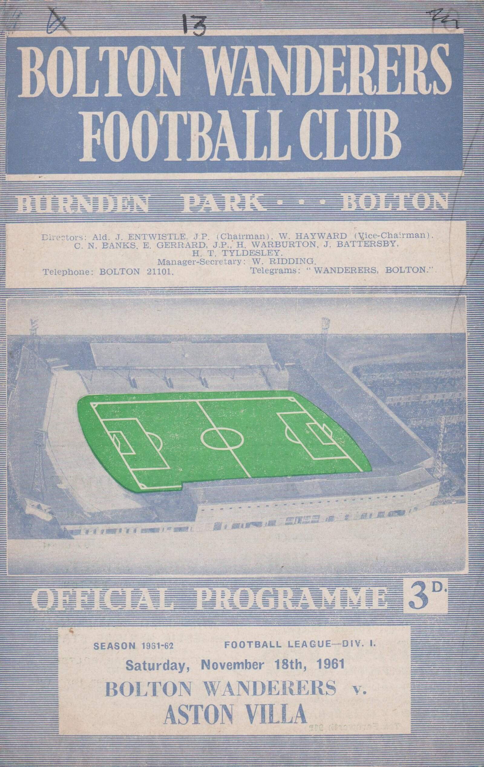 Match: Bolton Wanderers v Aston Villa Competition: League Division 1 Date: 18-Nov-1961 Comments: Rating: 3 Condition: Numbers on face, score on back, cover detached Weight in grams: 40