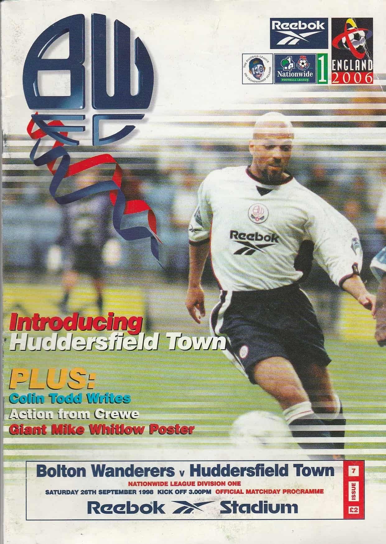 Match: Bolton Wanderers v Huddersfield Town Competition: League Division 1 Date: 26-Sep-1998 Comments: Rating: 3 Condition: Corner fold Weight in grams: 220