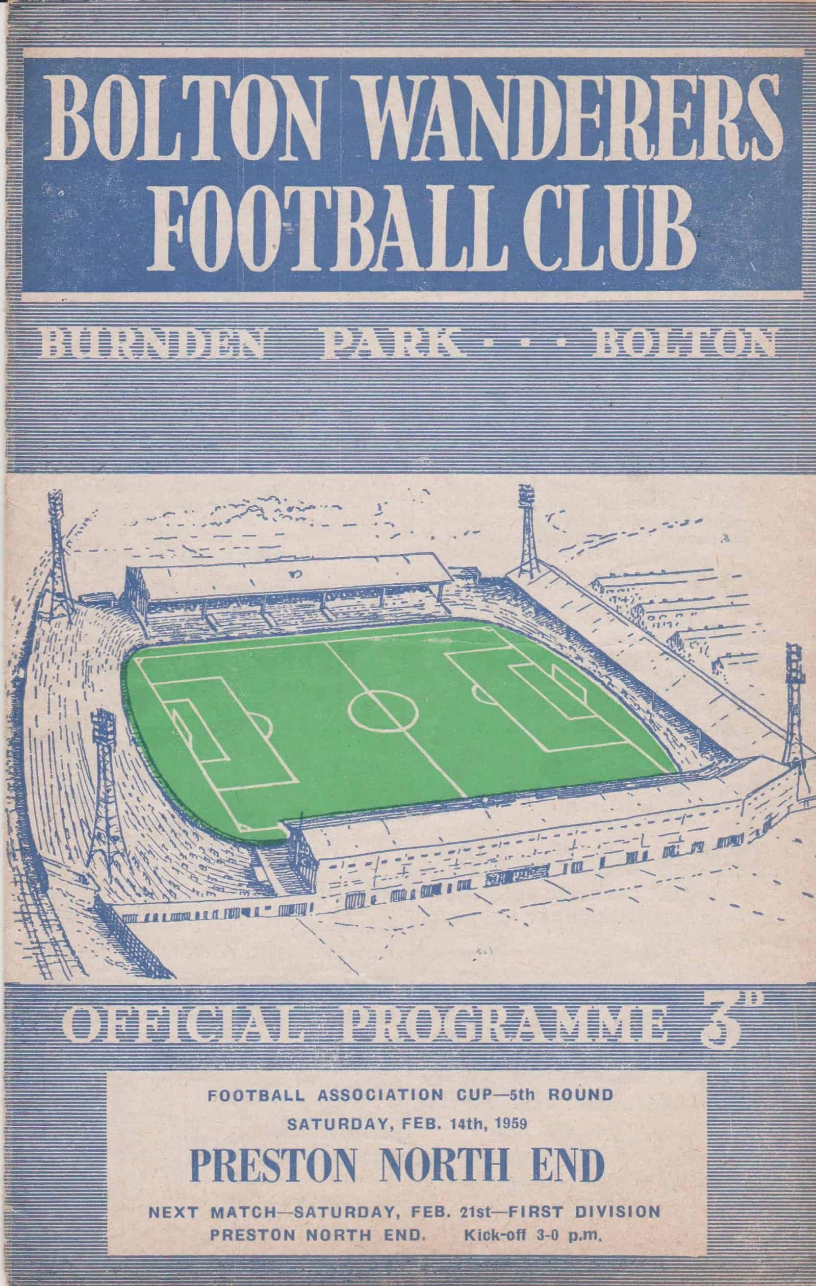 Match: Bolton Wanderers v Preston North End Competition: FA Cup 5th Round Date: 14-Feb-1959 Comments: Rating: 4 Condition: Faint fold Weight in grams: 40
