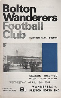 Match: Bolton Wanderers v Preston North End Competition: League Division 2 Date: 16-04-1969 Comments: Rating: 4 Condition: Mark on cover Weight in grams: 40