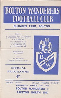 Match: Bolton Wanderers v Preston North End Competition: League Division 2 Date: 16-03-1966 Comments: Rating: 3 Condition: Faint fold, team changes Weight in grams: 40