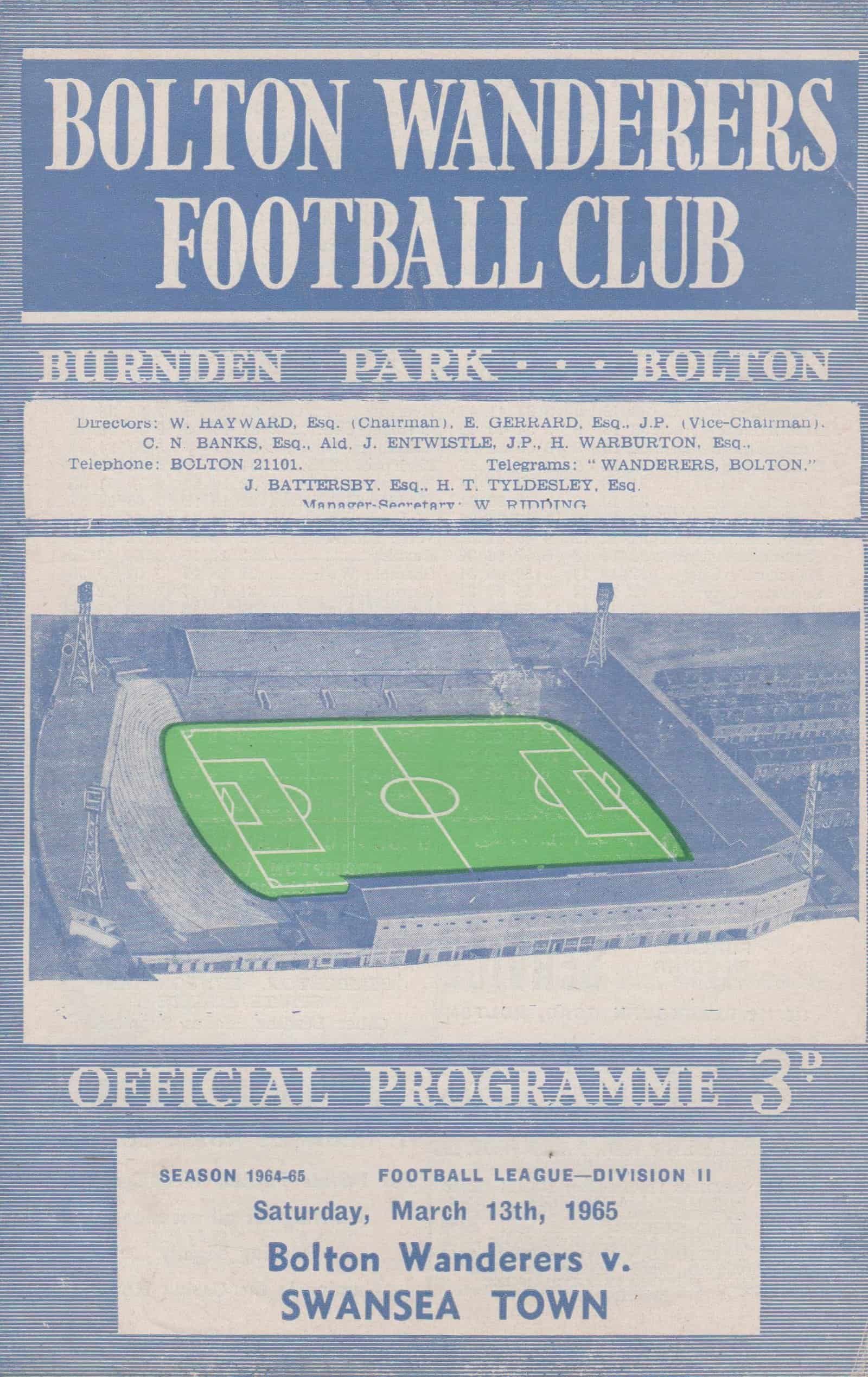 Match: Bolton Wanderers v Swansea Town Competition: League Division 2 Date: 13-Mar-1965 Comments: Rating: 3 Condition: Crease, score on front, score on back Weight in grams: 40