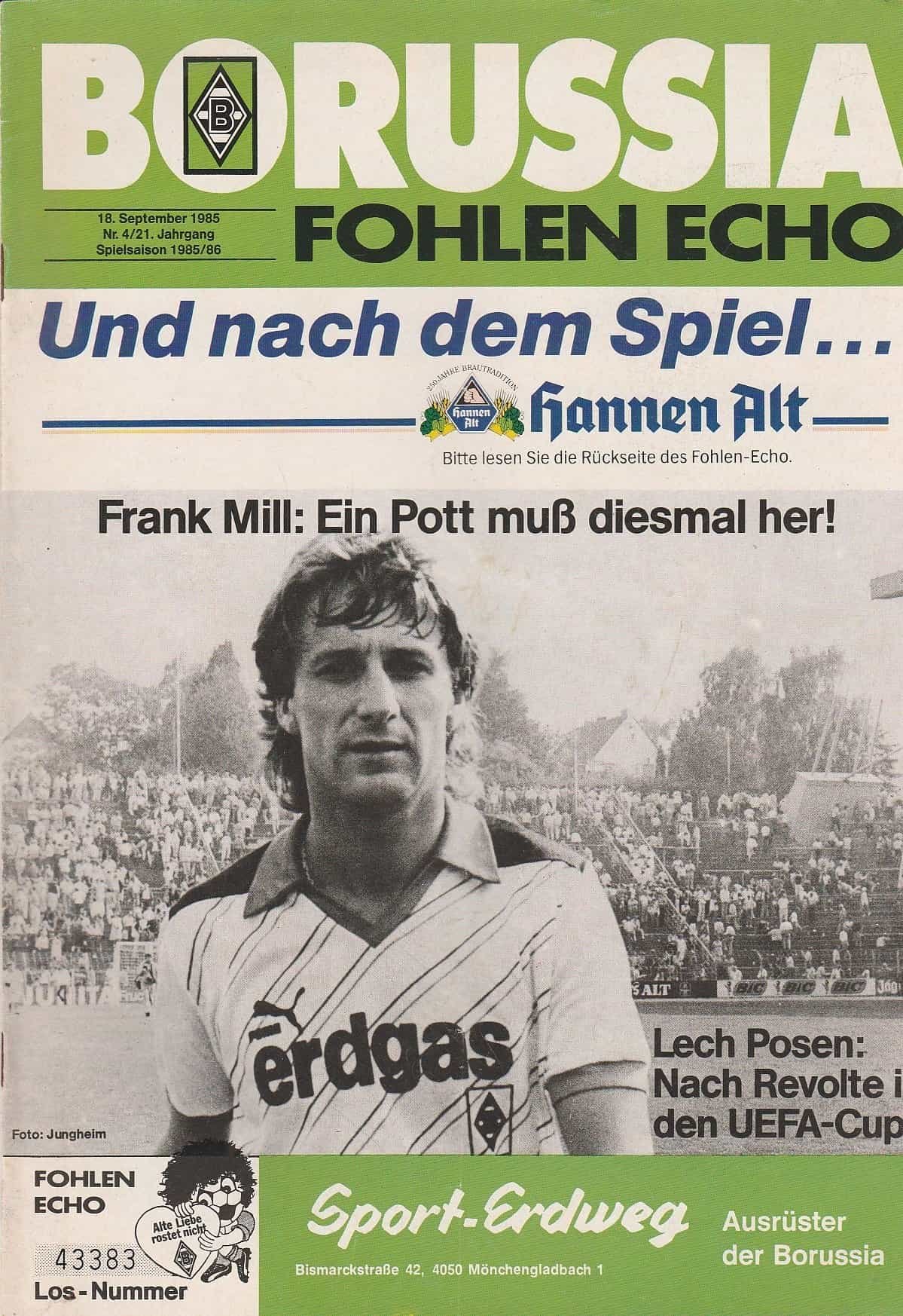 Match: Borussia Monchengladbach v Lech Poznan Competition: UEFA Cup 1st Round 1st leg Date: 18-Sep-1985 Comments: Rating: 4 Condition: Faint fold Weight in grams: 140