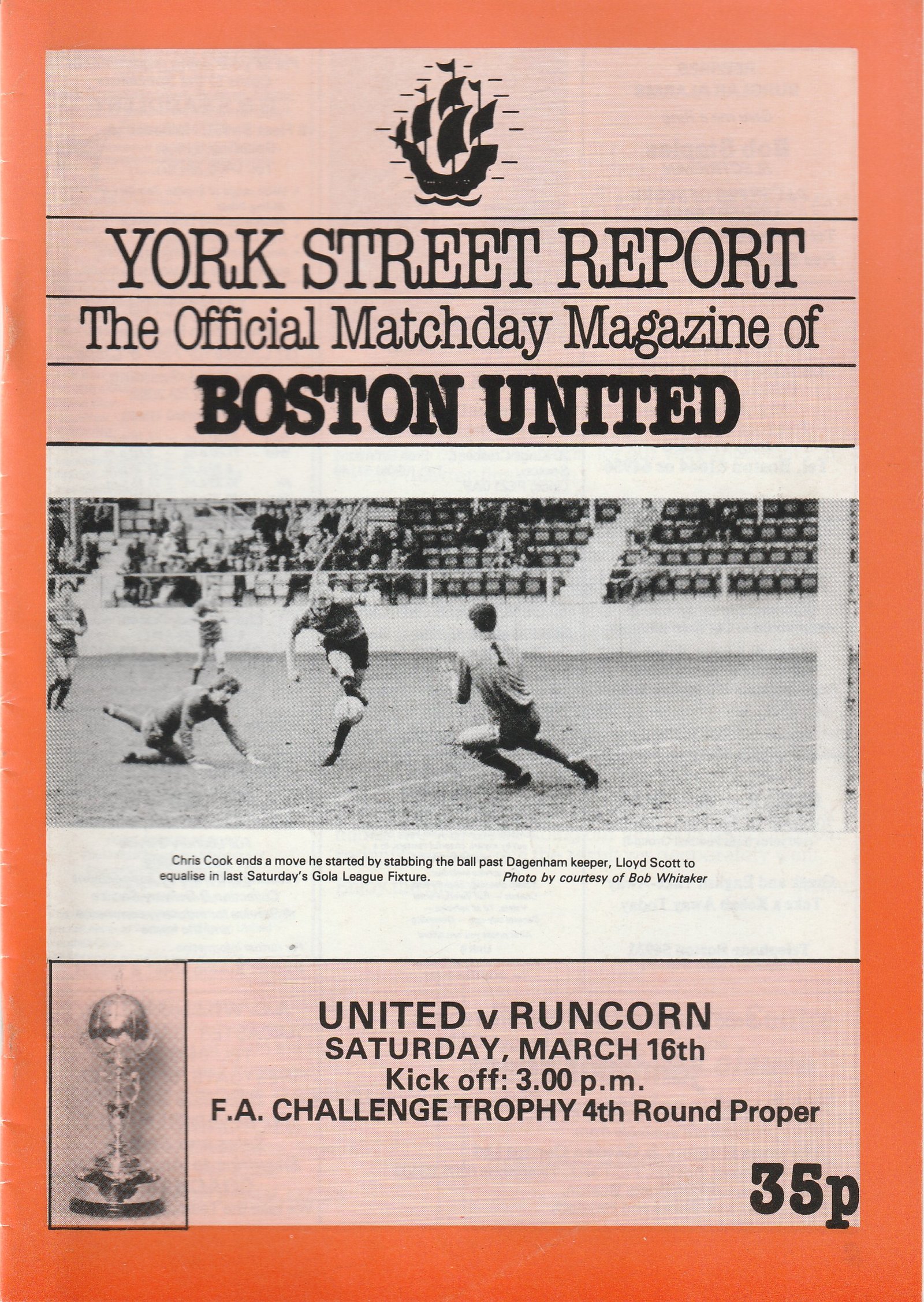 Match: Boston United v Runcorn Competition: FA Trophy 4th Round Date: 16-Mar-1985 Comments: Rating: 4 Condition: Very good Weight in grams: 120