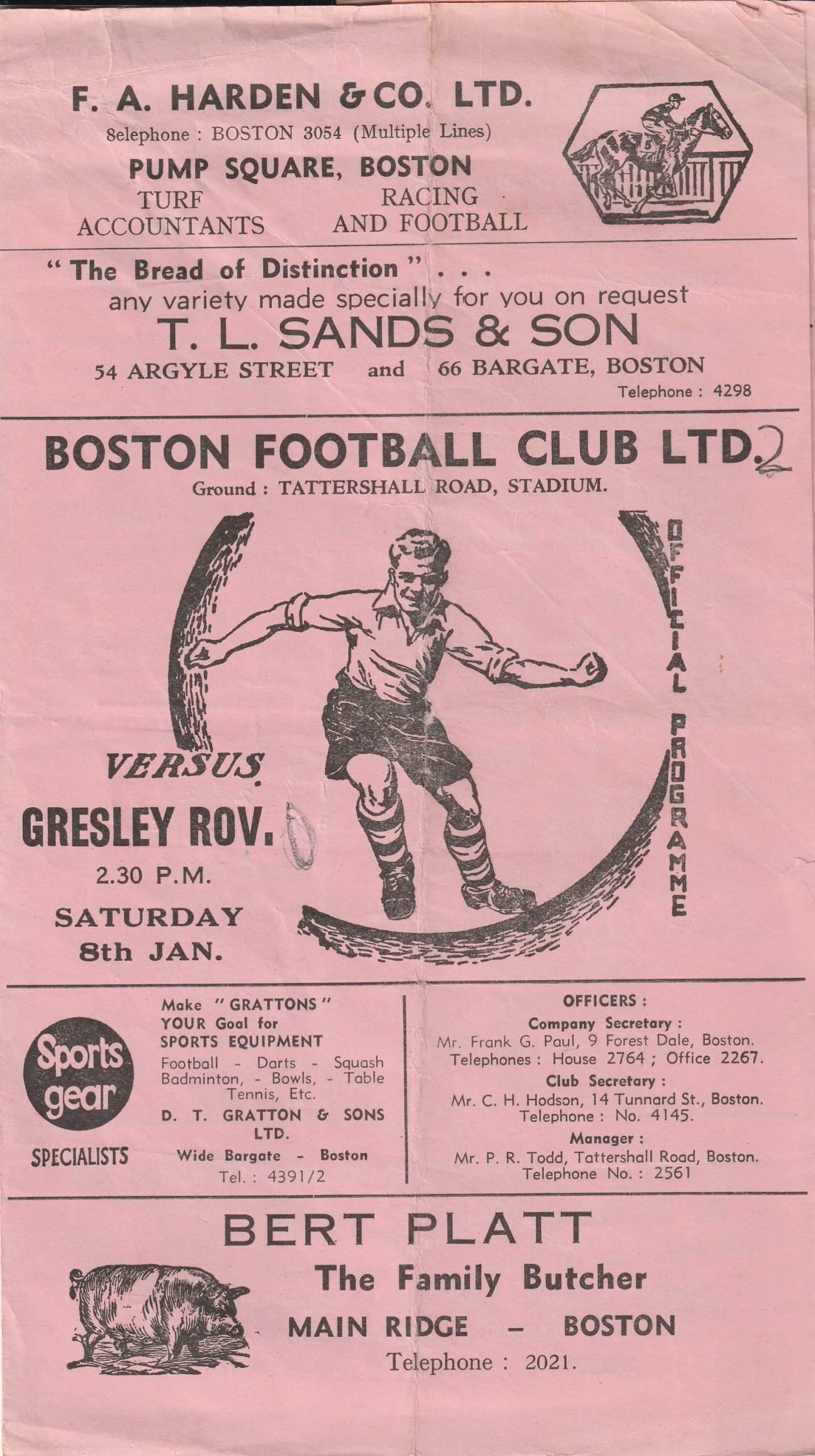 Match: Boston v Gresley Rovers Competition: Central Alliance League Date: 08-Jan-1965 Comments: Rating: 3 Condition: Fold and frayed top edge, mark on cover Weight in grams: 40