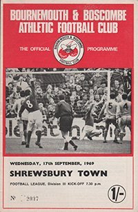 Match: Bournemouth and Boscombe Athletic v Shrewsbury Town Competition: League Division 3 Date: 17-09-1969 Comments: Rating: 4 Condition: Very good Weight in grams: 40