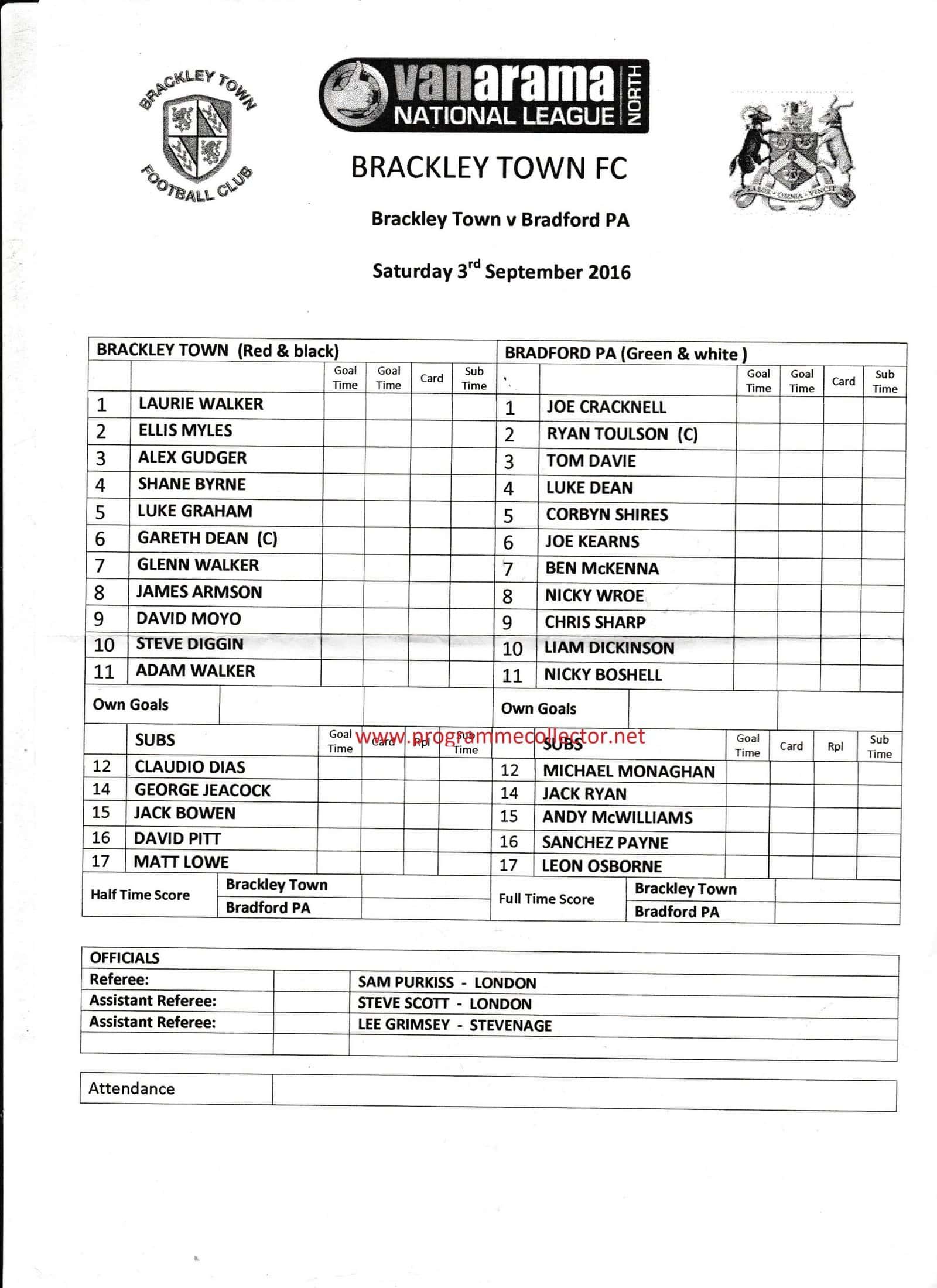 Match: Brackley Town v Bradford Park Avenue Competition: Vanarama League North Date: 03-Sep-2016 Comments: Rating: 3 Condition: Folds Weight in grams: 20