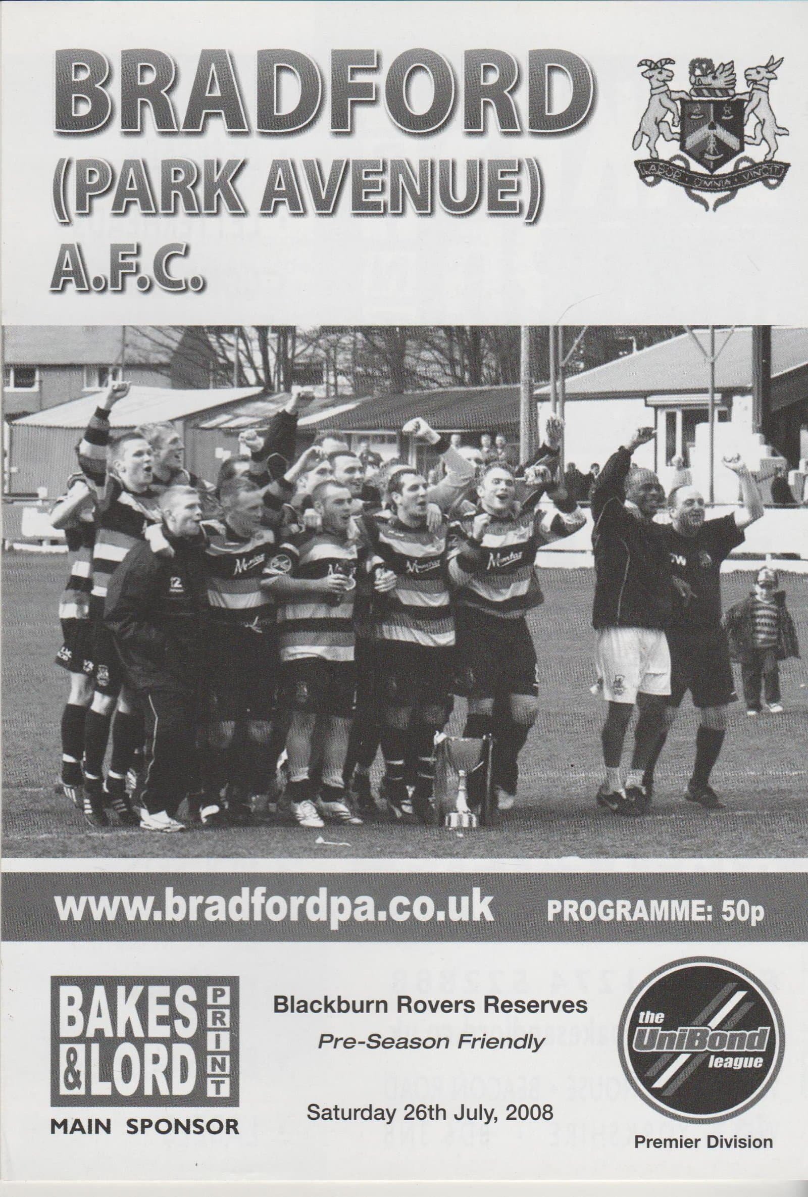 Match: Bradford Park Avenue v Blackburn Rovers Reserves Competition: Friendly Date: 26-Jul-2008 Comments: Rating: 4 Condition: Very good Weight in grams: 40