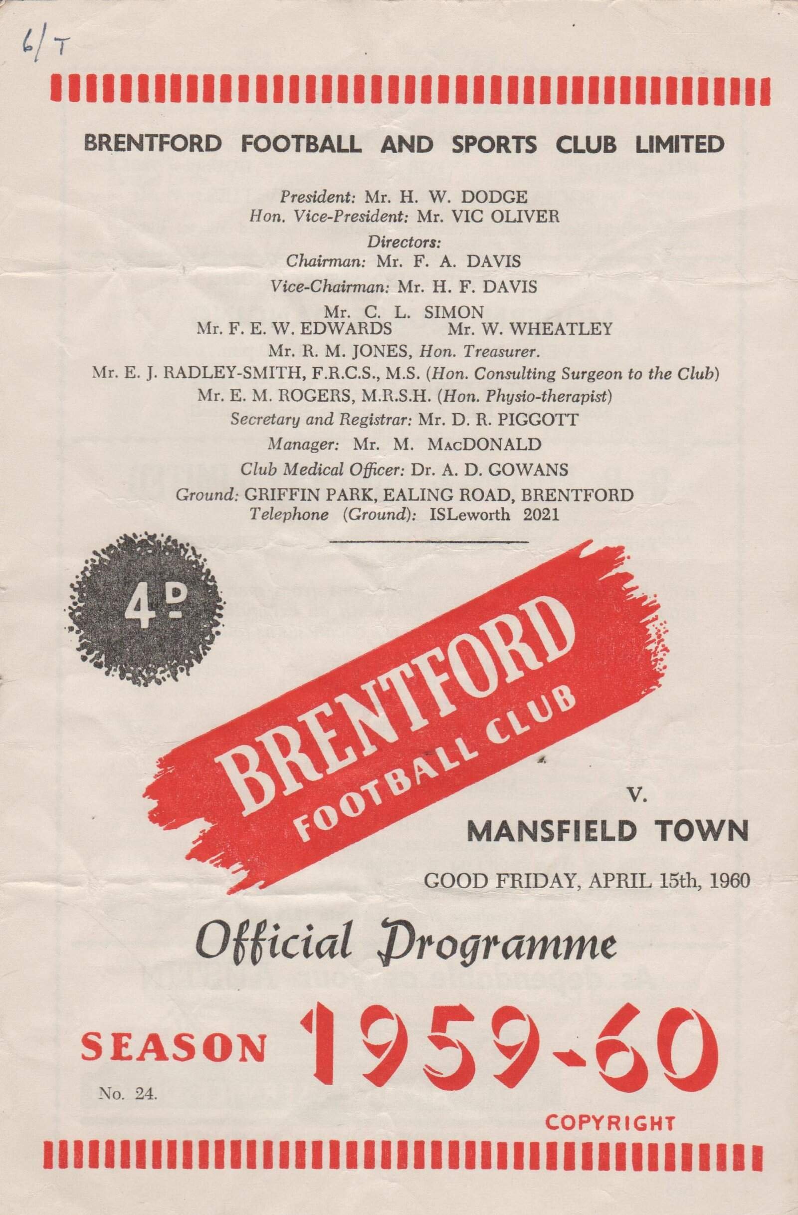 Match: Brentford v Mansfield Town Competition: League Division 3 Date: 15-Apr-1960 Comments: Rating: 3 Condition: Fold, number on face, team changes in pencil, nicks and soiling on centre fold Weight in grams: 60
