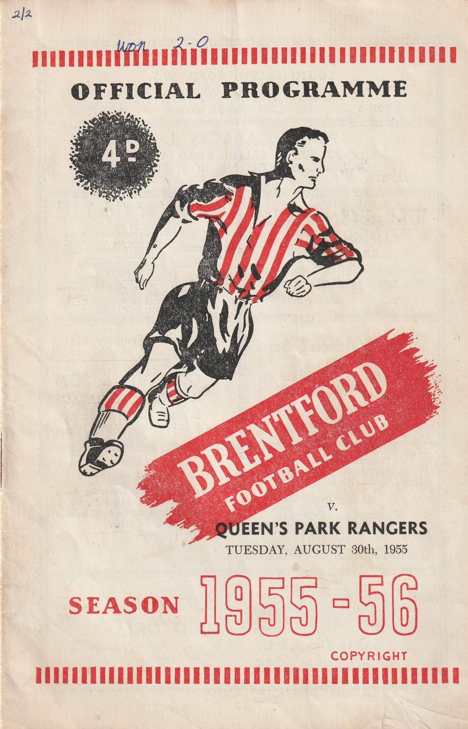 Match: Brentford v Queens Park Rangers Competition: League Division 3 South Date: 30-Aug-1955 Comments: Rating: 3 Condition: Writing and light soiling on cover, light crease on corner of cover Weight in grams: 40